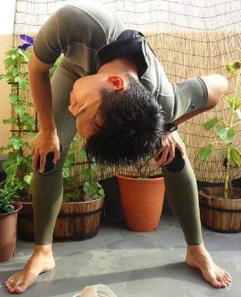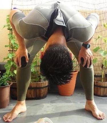 1. 먼저 머리를 천천히 숙이면서 팔을 무릎에 대고 지지합니다.
