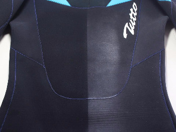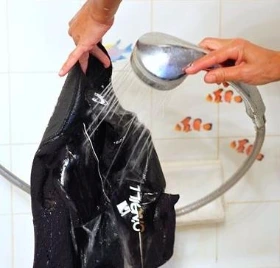 가볍게 세척합니다. 이때, 반드시 찬물이나 미지근한 물을 사용하십시오. 온수는 잠수복 원단 자체를 손상시켜