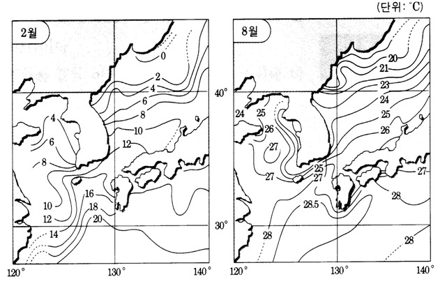 위의 그림을 보면 8월에는 동해안과 서해안의 수온 차이가 크게 없으나 2월에는 수온 차이가 있는 것을 볼 수