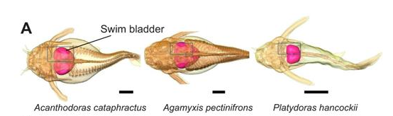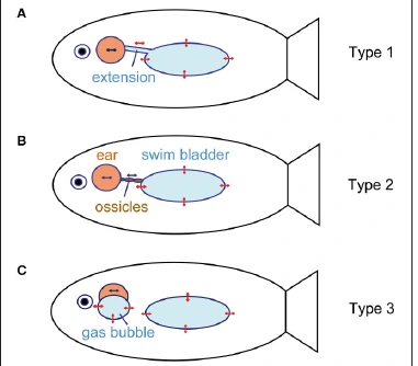 이를 비유하자면, 손바닥 위에 큰 젤리를 올려놓고, 손을 갑자기 한쪽으로 움직였을 때, 젤리가 잠시 뒤늦게 따라 움직이는 현상과 비슷하겠네요. 물고기의 청각도 이와 같습니다. 물과 함께 움직이는 몸에 비해 이석이 약간 늦게 따라오면서 기준점 역할을 하게 되고, 이로써 입자 운동이 감지되는 것이죠. 즉, 물고기는 ‘소리 압력’을 듣는 것이 아니라, 소리에 의해 발생하는 물 입자의 미세한 입자 운동을 느낍니다. 이러한 감지 방식에는 몇 가지 한계가 있습니다. 감지 가능한 주파수는 수백 헤르츠 정도로 낮고, 일정 이상의 강한 진동이 있어야 하며, 소리의 발원이 멀리 떨어져 있으면 잘 인식되지 않습니다. 하지만 일부 어류는 이러한 한계를 보완하는 구조로 되어 있습니다. 예를 들어, 부레가 진동을 속귀로 전달함으로써 청각을 돕는 역할을 하기도 하는 것이 그것이죠. 민물고기 중에는 이 기능이 더 발달한 종들도 있어요. 이들은 부레의 앞쪽과 속귀를 작은 뼈 구조인 ‘웨버 뼈(Weberian ossicles)’로 연결해, 소리의 진동이 더 효율적으로 전달되도록 돕습니다.