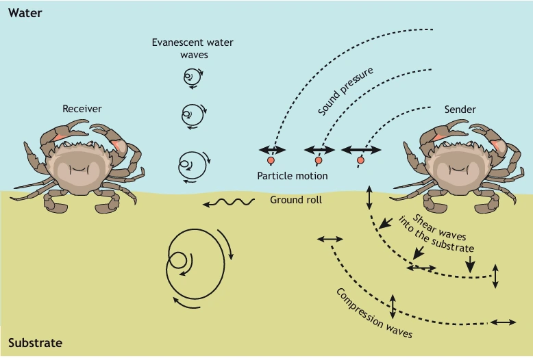 바닷가재나 새우를 직접 잡아본 적이 있나요? 아니라면 예능 프로그램 등에서 갑각류를 잡는 것을 본 적이 있을지도 모르겠습니다. 사람이 조심스럽게 다가가서 분명 손에 잡았다고 생각한 순간, 그들은 순식간에 뒤로 튀어 도망가 버리죠. 놀라울 정도로 빠른 이 반응은, 갑각류가 가진 정교한 감각 기관 덕분입니다. 갑각류는 온몸에 퍼져 있는 감각털과 관절 부위에 위치한 현향기관을 통해 주변의 미세한 진동과 움직임을 감지합니다. 무엇보다, 바닷속에서는 소리가 단지 물을 타고 전달되는 것이 아닙니다. 해저의 단단한 바닥이나, 물과 지면 사이의 경계면을 따라 ‘지면 파(ground roll)’라는 방식으로도 퍼집니다. 이 지면 파는 입자의 움직임이 크고, 일반적인 물속 소리보다 훨씬 빠르게, 더 멀리 전파됩니다. 이런 소리의 흐름을 누구보다 먼저 감지할 수 있는 능력은 바다 바닥이나 그 근처에서 생활하는 갑각류에게 큰 이점을 줍니다. 포식자가 다가오는 기척을 남들보다 먼저 알아차리고 그 짧은 순간을 틈타 재빠르게 도망칠 수 있는 것이죠.