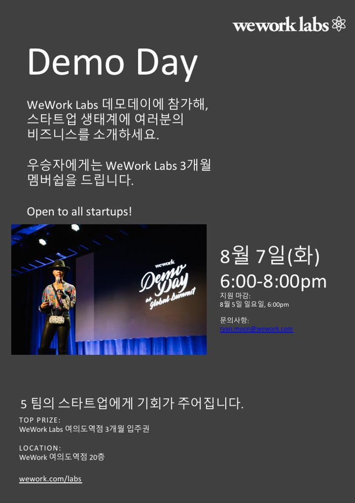 우승자에게는 WeWork Labs 3개월 입주권을 드립니다.