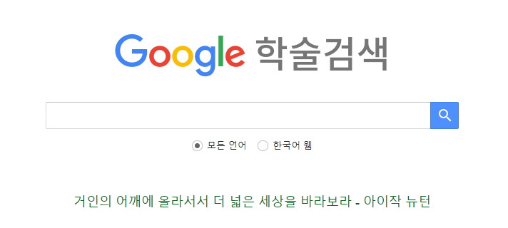 Google Scholar 첫 화면에는 뉴턴이 말했던, "거인의 어깨에 올라서서 더 넓은 세상을 바라보라."라는 문구가 적혀 있습니다. 낮은 곳에 있으면 좁은 시야로 세상을 바라볼 수밖에 없습니다. 뉴턴의 말처럼 거인의 어깨에 올라서면 더 넓은 세상을 전체적으로 바라보며 내가 어디에 있는지, 내가 해결해야 할 문제가 어디쯤에 있는지를 확인하고 해결해 나갈 수 있게 되는 것입니다.