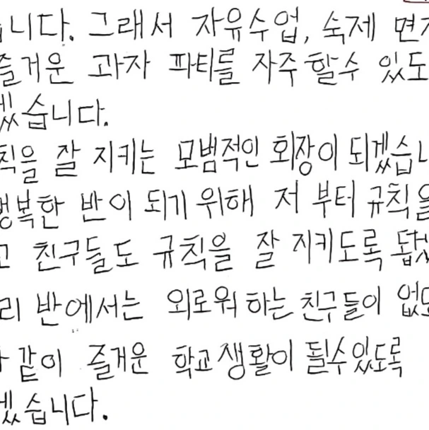 멋지게 리허설까지 끝낸 아들이었지만, 제대로 할 수 있을지 걱정이 되었고, 혹시나 당선되지 못했을 때의 아이의 실망감도 염려되어 그날 오전 내내 일이 손에 잡히지 않았다. 그리고 오후에 아내에게 반가운 전화가 왔다. 아들이 학급 회장에 당선되었다는 소식과 함께!