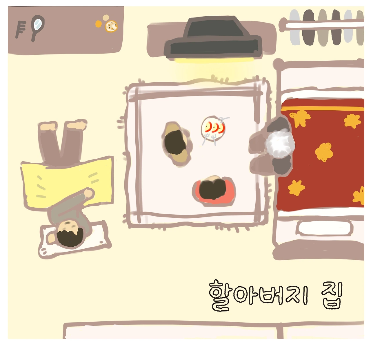 어? 분명히 어제 나는 퇴근하고 집에 들어와서 기절하듯 내 방 침대에서 잠들었는데... 이상하게도 시골 큰집에서 눈을 뜨게 되었다. 멋쩍게 웃으며 몸을 일으켜 침대 쪽을 보니 할아버지, 할머니가 앉아계셨다.