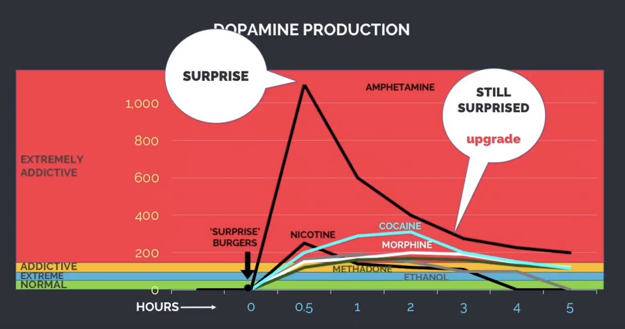 첫 번째 원인의 가장 극단적인 예는 도파민 시스템에 작용해, 도파민의 양을 인위적으로 늘리는 약물을 들 수 있을 것이다. 일상적인 수준보다 수십 배에 달하는 도파민 반응을 불러오는 암페타민, 코카인 등의 마약들은 그 중독성으로 악명이 높다. 도파민을 크게 증가시키는 니코틴 또한 중독성이 강한 것으로 알려져 있다. 도파민은 참신한 것, 기대 이상의 것에 대한 반응이다. 이 신호는, ‘앞으로 이 자극의 원천을 지속적으로 추구하는 것이 이롭다’는, 신경의 프로그램 언어이다.