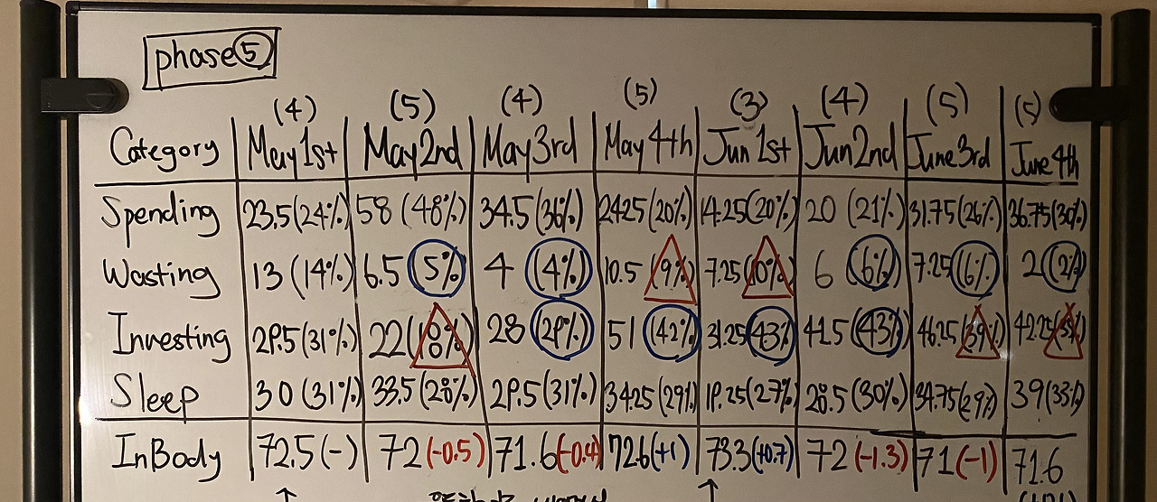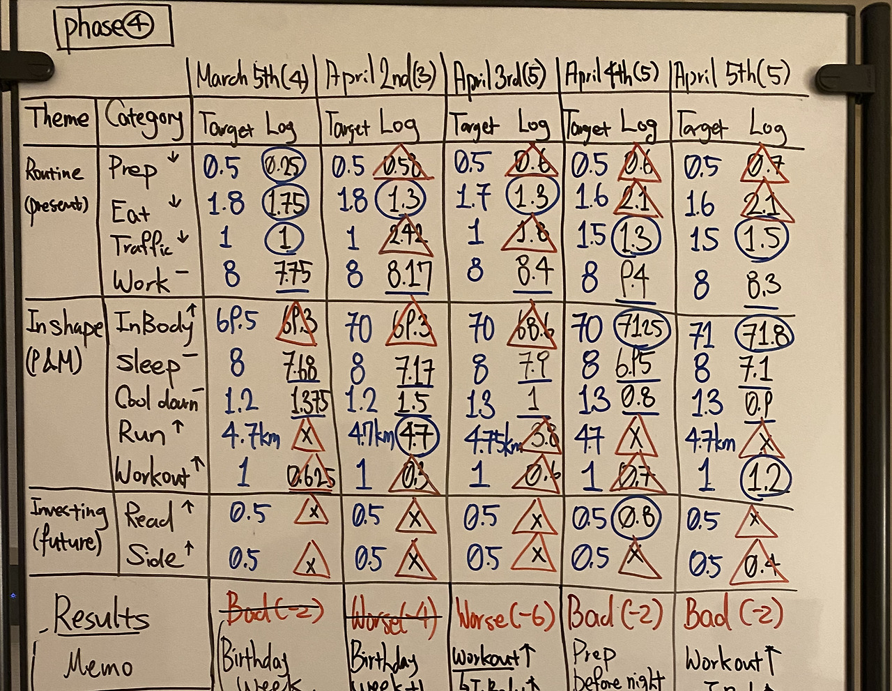 두 달 동안 초기단계에 해당하는 phase 1, 2, 3을 진행하다 보니 이제는 어느 정도 틀이 잡혔다. 나는 매번 화이트보드에 적어가며 분석을 했기 때문에 여기서 좀 더 효율적으로 중복되는 항목을 묶어줄 필요가 있었다. 그래서 phase 3 방식에 x 축 y 축을 바꾸기로 했다. 테마 (theme)와 카테고리 (category)는 내 생활패턴에서 고정이 되어 좌측에 세로축으로 배치하고, 매주 한 줄씩 목표(target)와 기록(log)을 세로로 채워 넣었다. 좀 더 효율적으로 기록하고 분석할 수 있게 되었다.