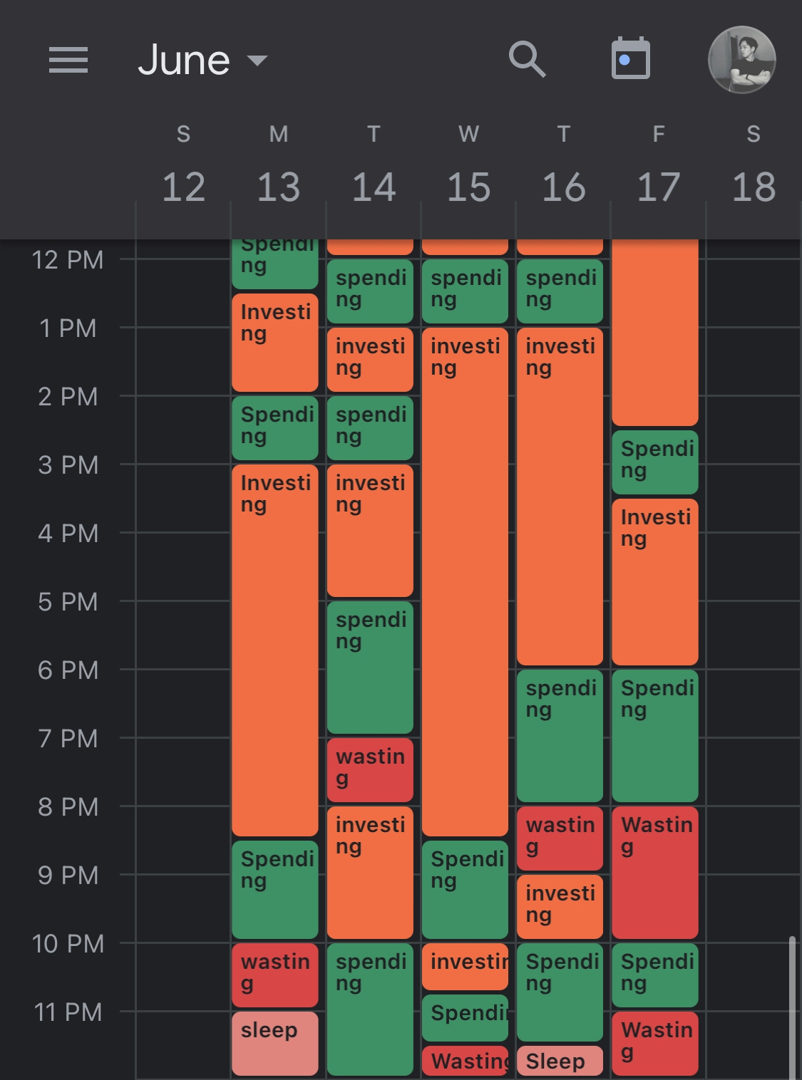 세 달 간의 기록방식을 보니 이제는 라벨링 방식이 좀 더 목적 지향적이면 좋겠다는 생각을 했다. 지금까지 해온 방식은 밥 먹는 시간을 "eat"라고 기록하고, 업무시간을 "work"라고 기록하는 식이었다. 이렇게 기록을 하니 기록들을 분석할 때 그 시간의 목적이 뚜렷하게 보이지 않았다. 그래서 내가 보낸 시간이 잘 보낸 시간인지 아닌지 평가하기가 어려웠다. 그래서 시간의 라벨링 방식을 바꾸기로 했다. 라벨링 자체에 나의 평가를 넣어서 소비(spending), 낭비(wasting), 투자(investing) 시간으로 쪼개는 방식을 떠올렸다. 완전한 가계부의 형태를 갖춘 시간 기록 방식이었다.
