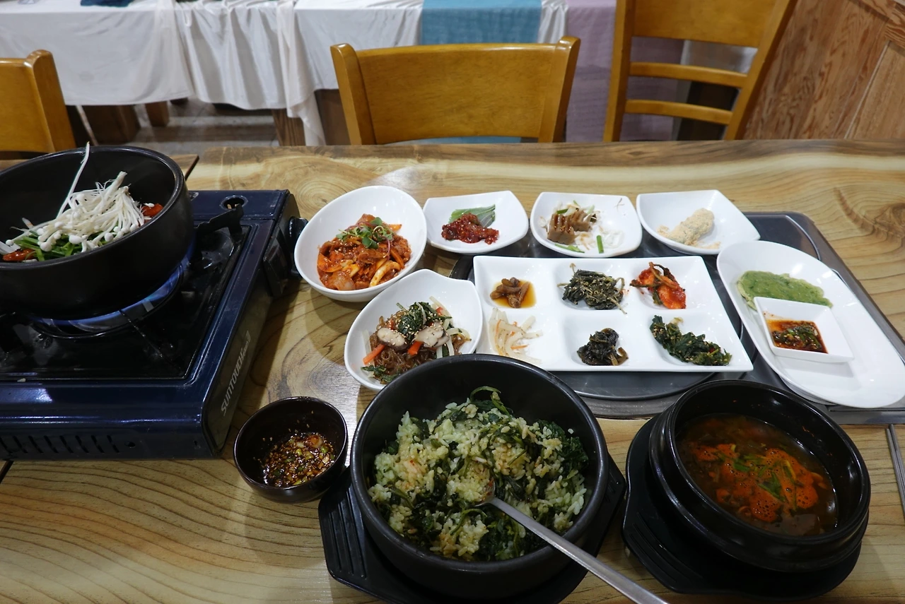 그러나 음식이 나오는 것을 보고 오길 잘했다는 생각 했다. 더덕을 돌솥에 구워주고 그렇게 구운 더덕을 곤드레밥 위에 얹어먹는다. 밑반찬으로는 제육, 잡채, 전, 찌개 등이 푸짐하게 나왔다.