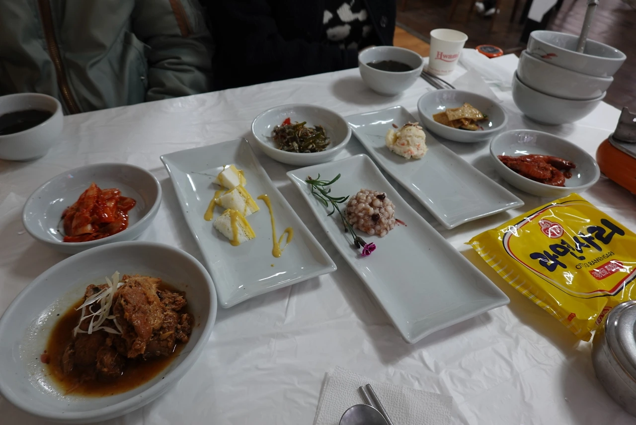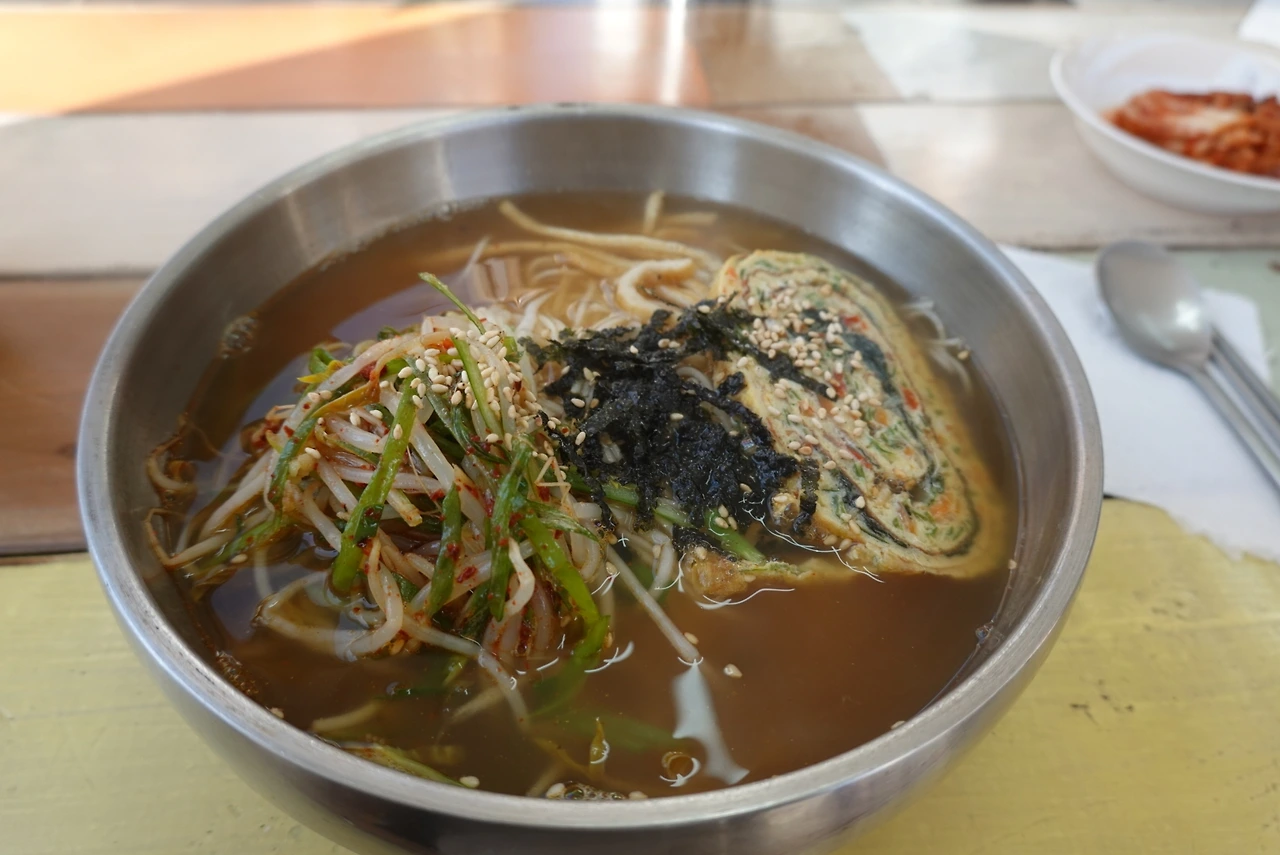 일행이 다 모이니 어느새 11:30이 넘었다. 화려한 점심을 먹으려 했으나 숙소에 짐도 갖다 놓아야 하고 등산도 해야 했기에 마음이 조급했다. 그래서 터미널에서 가까운 국수가게에서 국수를 먹기로 했다. 메뉴는 잔치국수와 비빔국수(모두 6,000원)로 간단했다. 아침부터 뛰어다닌탓인지 뜨끈한 국물이 먹고 싶어서 잔치국수를 주문했다. 국물이 달달한 것이 독특하면서도 맛있었다. 그리고 엄청 크고 푸짐한 계란말이가 들어가 있어서 꽤 든든했다.