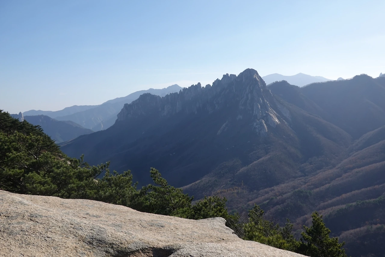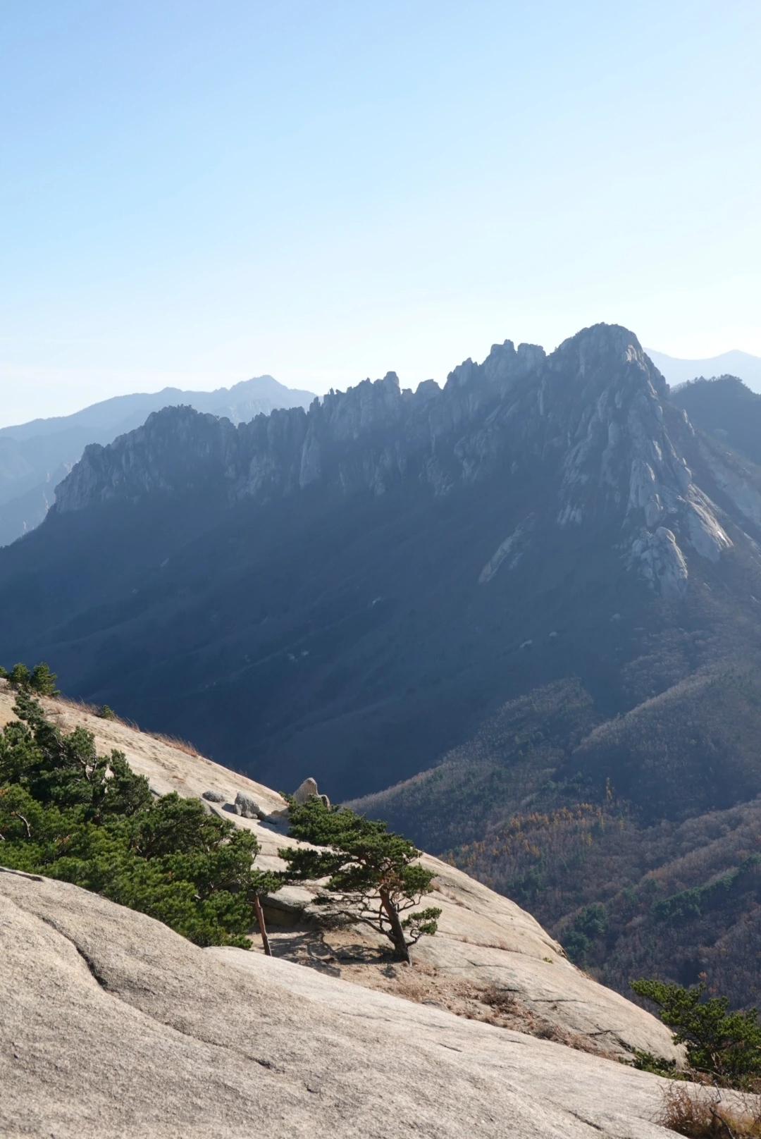 그리고 바다의 반대 방향을 바라보면 이렇게 위풍당당한 울산바위를 감상할 수 있다. 진짜 멋있었다. 등산하면서 산 자체가 멋있다기보다는 뻥 뚫린 높은 곳에서 바라본 풍경이 멋있다고 생각하는데 이곳은 산 자체가 정말 멋있었다. 한 가지 아쉬운 것은 점심이 지나서 올라오니 해가 울산 바위 뒤쪽에 있어서 사진이 역광으로 찍힌다는 것 ㅠㅠ 아침 일찍 올라왔다면 동해에서 뜨는 태양이 울산바위를 비춰서 더 멋있었을 것 같다.