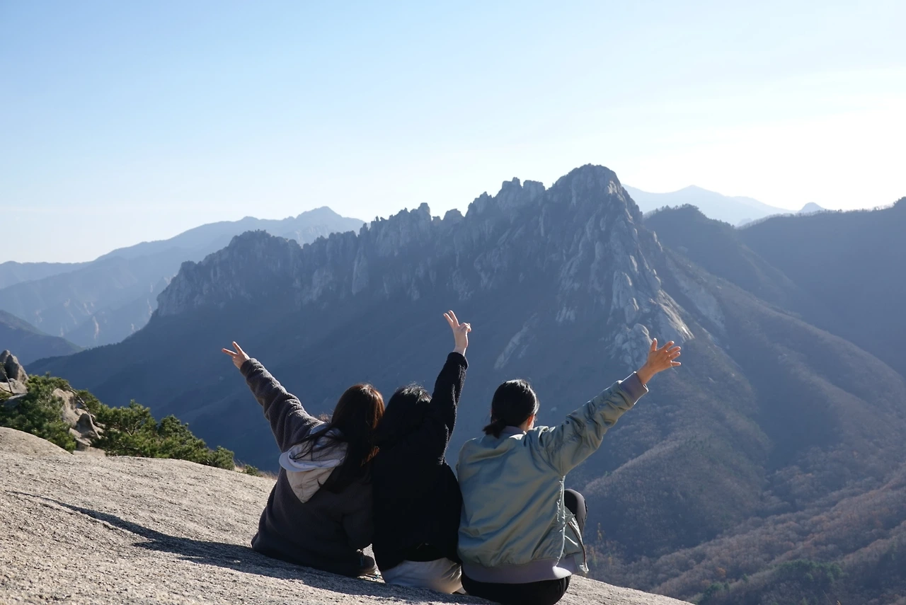 울산바위를 바라보며 일행들과 사진도 여유롭게 찍었다. 오후에 가니 사람도 별로 없었고, 성인대가 생각보다 평평하고 넓어서 여유롭게 사진을 찍을 수 있었다. 성인대 끝쪽으로 가면 사진이 더 잘 나온다고 하는데 셋다 쫄보라서 그냥 판판한 곳에서 사진을 찍고 내려왔다. 인스타를 보면 이곳에서 진짜 멋지게 사진 찍는 사람들 많다. 대단쓰~~