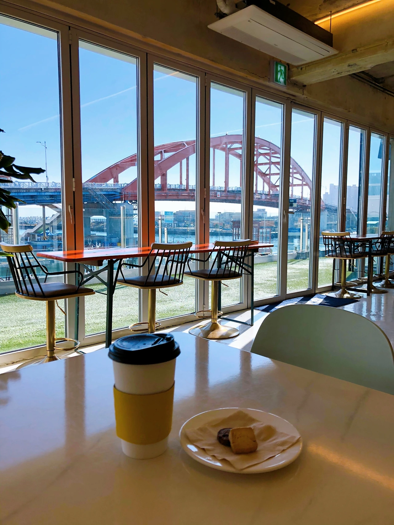 원래 가려한 카페가 문을 안 열어서 그 옆에 카페에 갔는데 훨씬 더 전망이 좋았다. 수협 건물을 복합 문화 공간으로 새롭게 탄생시킨 곳이라고 한다. 카페가 굉장히 넓었는데 아침이라 나밖에 없어서 더 좋았고, 창밖으로 펼쳐진 뷰도 정말 좋았다. 속초가 아니라 뉴욕의 브루클린 브릿지 느낌(물론 가본 적은 없지만..;;)ㅋㅋ 암튼 푸른 바다와 그 위로 시원하게 뻗은 다리가 멋져 보였다.