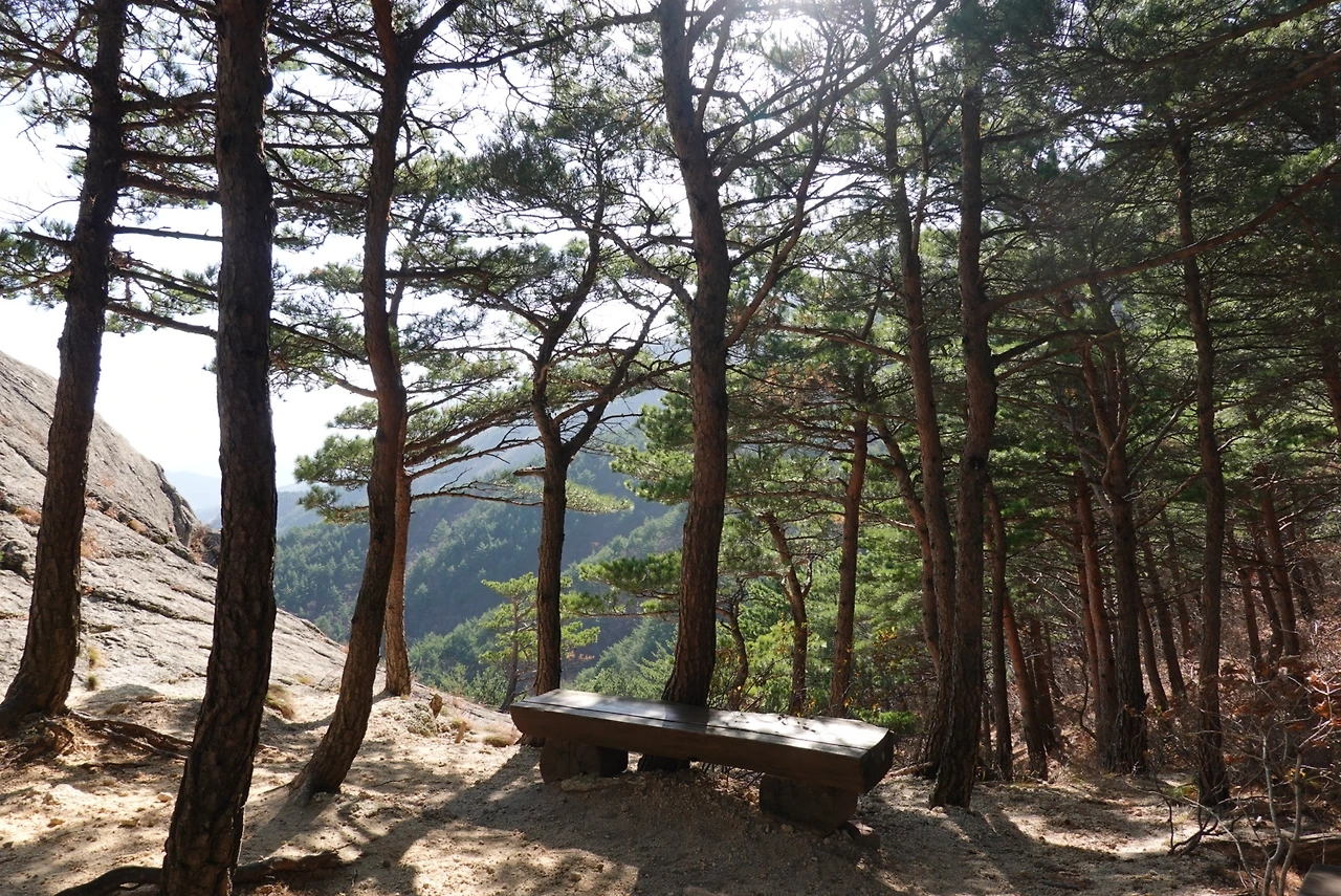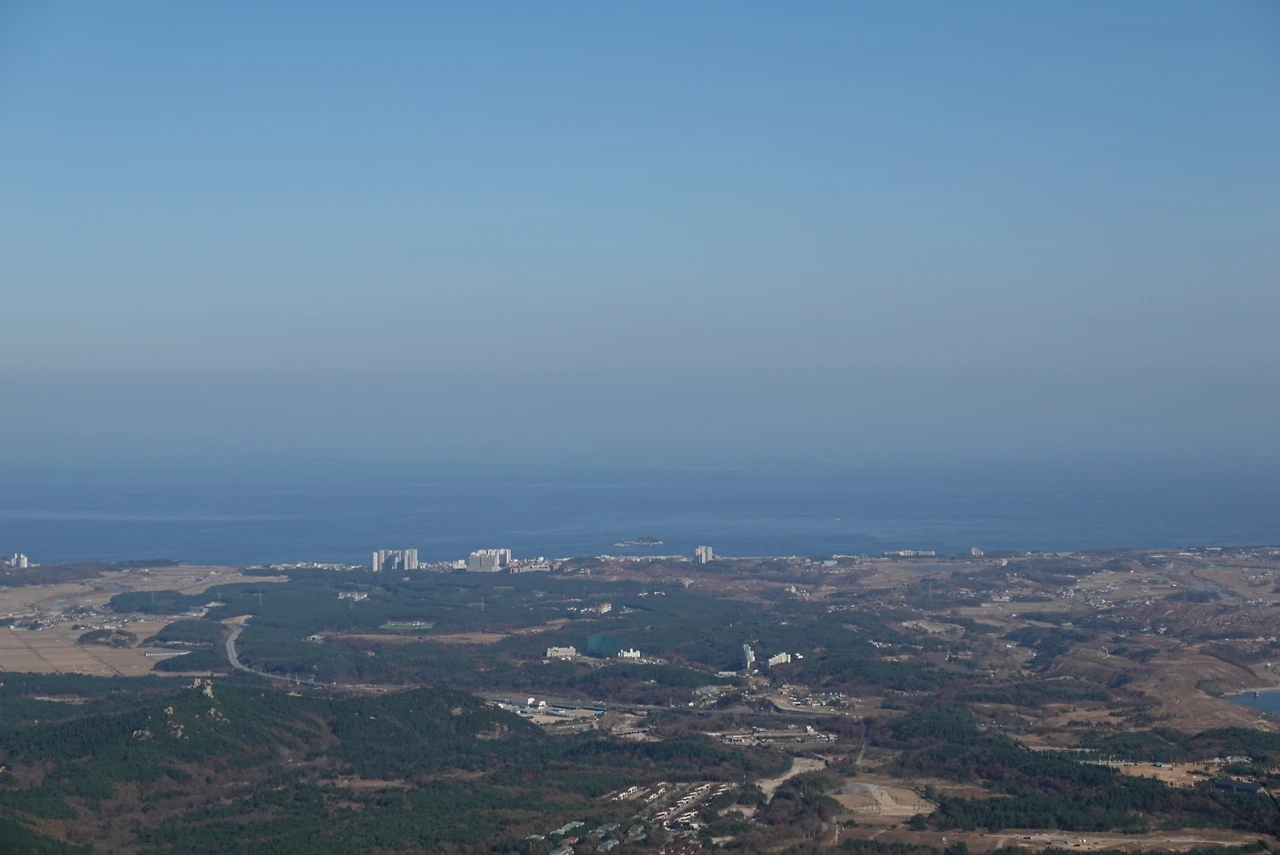 올라가면 한쪽 방향으로는 이렇게 푸른 동해 바다가 펼쳐진다. 보통 산에 올라가면 굽이굽이 흐르는 산을 구경하기 마련인데 하늘과 구분되지 않는 푸른 바다를 볼 수 있어 감회가 새로웠다.