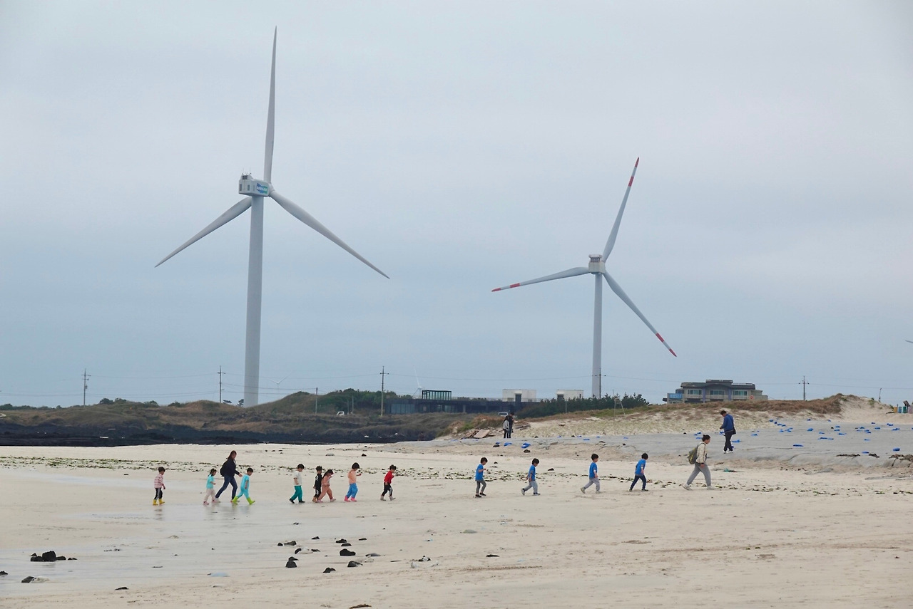 해변이 예뻐 잠깐 차에서 내려 구경했다. 제주도의 어린이들은 바다로 산책을 나오는듯 싶었다. 선생님을 따라 하얀 모래사장을 한줄로 걷는 모습이 참 이뻤다.