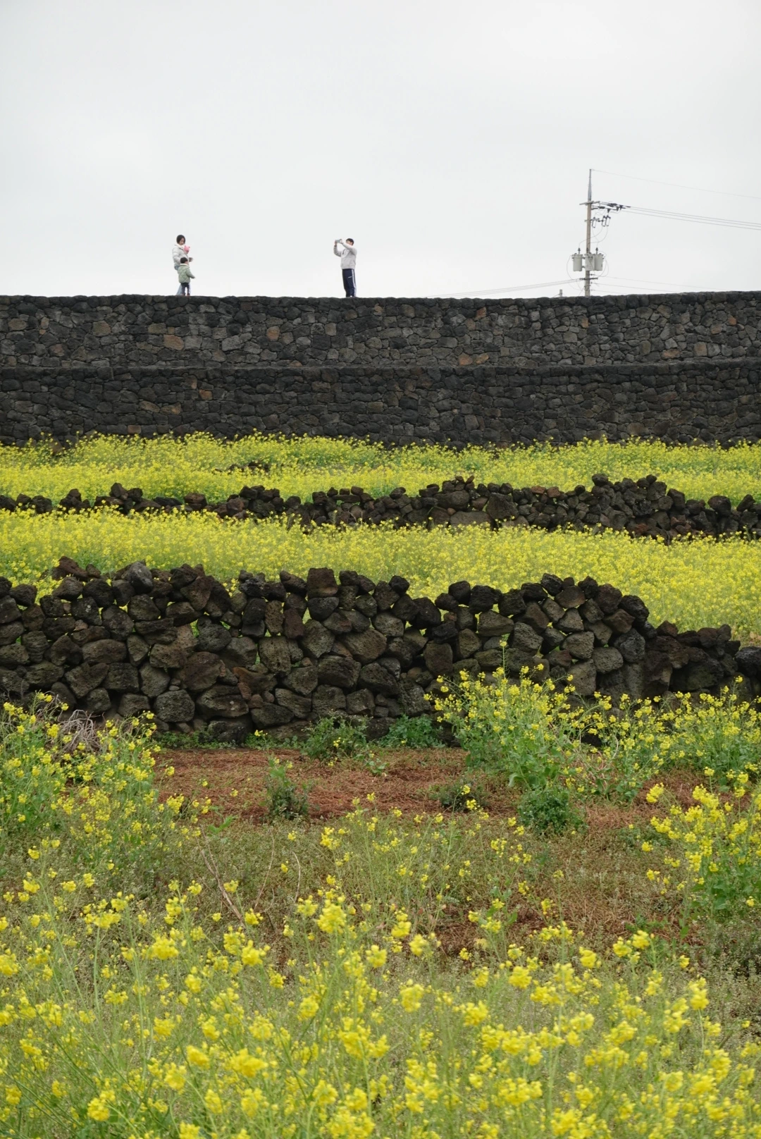 높이 쌓인 돌담 안쪽으로 들어가니 유채꽃이 가득했다. 비로 촉촉하게 젖은 유채꽃에서 유채꽃 향이 확 났다.