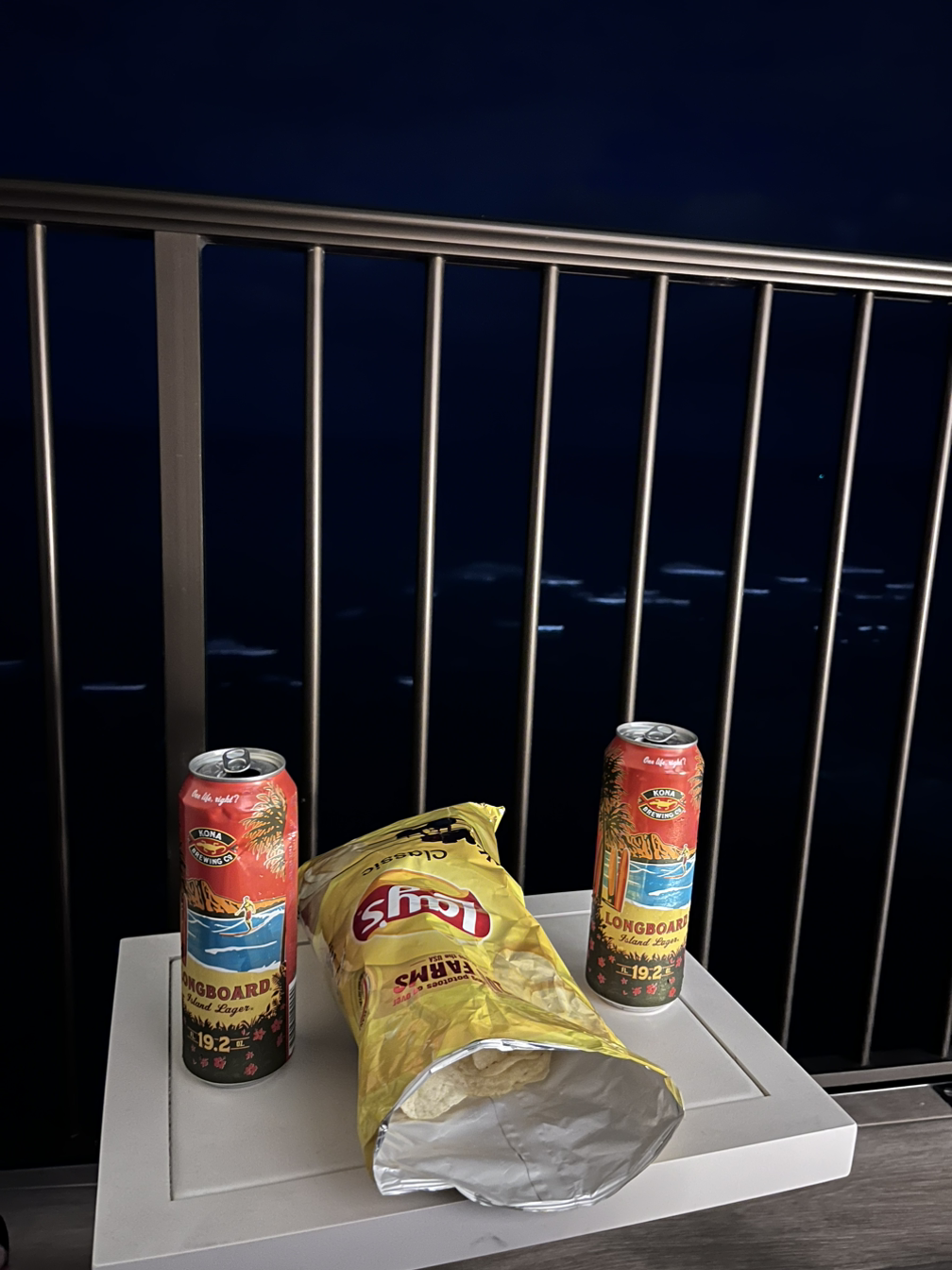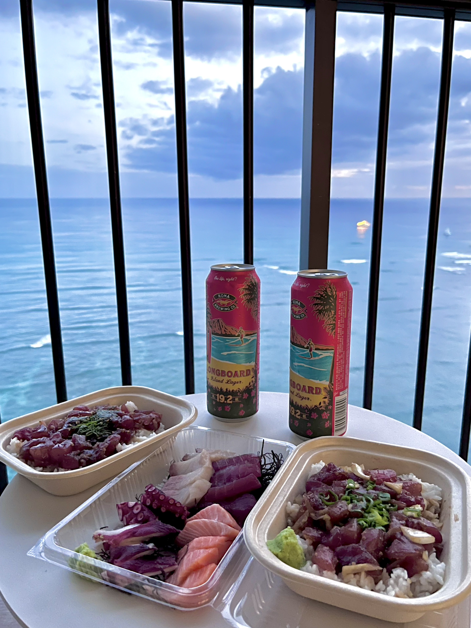 짐만 놓고 바로 나와서 저스틴(가이드님)이 추천해 준 포케, 사시미 맛집으로 향했다. 테이크아웃만 가능한 곳이라고 하여 사들고 호텔 테라스에서 바다를 보며 먹을 생각이었다. 유명한 맛집인지 픽업만 가능한데도 주문하려고 줄 서있는 사람들이 꽤 있었다. 다행히 줄은 빨리 빠져서 포케 2개와 사시미 플래터를 시켰다. 오는 길에 롱보드 맥주 2캔도 사 왔다. 그리고 호텔 테라스에 착석!! 와이키키 그 어느 곳보다 좋은 뷰가 아닐까 생각하며 음식을 먹었다. 신랑은 파도 소리를 들으면서 먹을 수 있어서 좋다고 했다. 맛도 아주 좋았다. 특히 사시미플래터에서 고등어 회인지가 아주 맛있었다. 개인적으로 남은 기간 중에 한번 더 먹고 싶은 맛….!!! 후식으로 사 온 감자칩까지 먹었다.