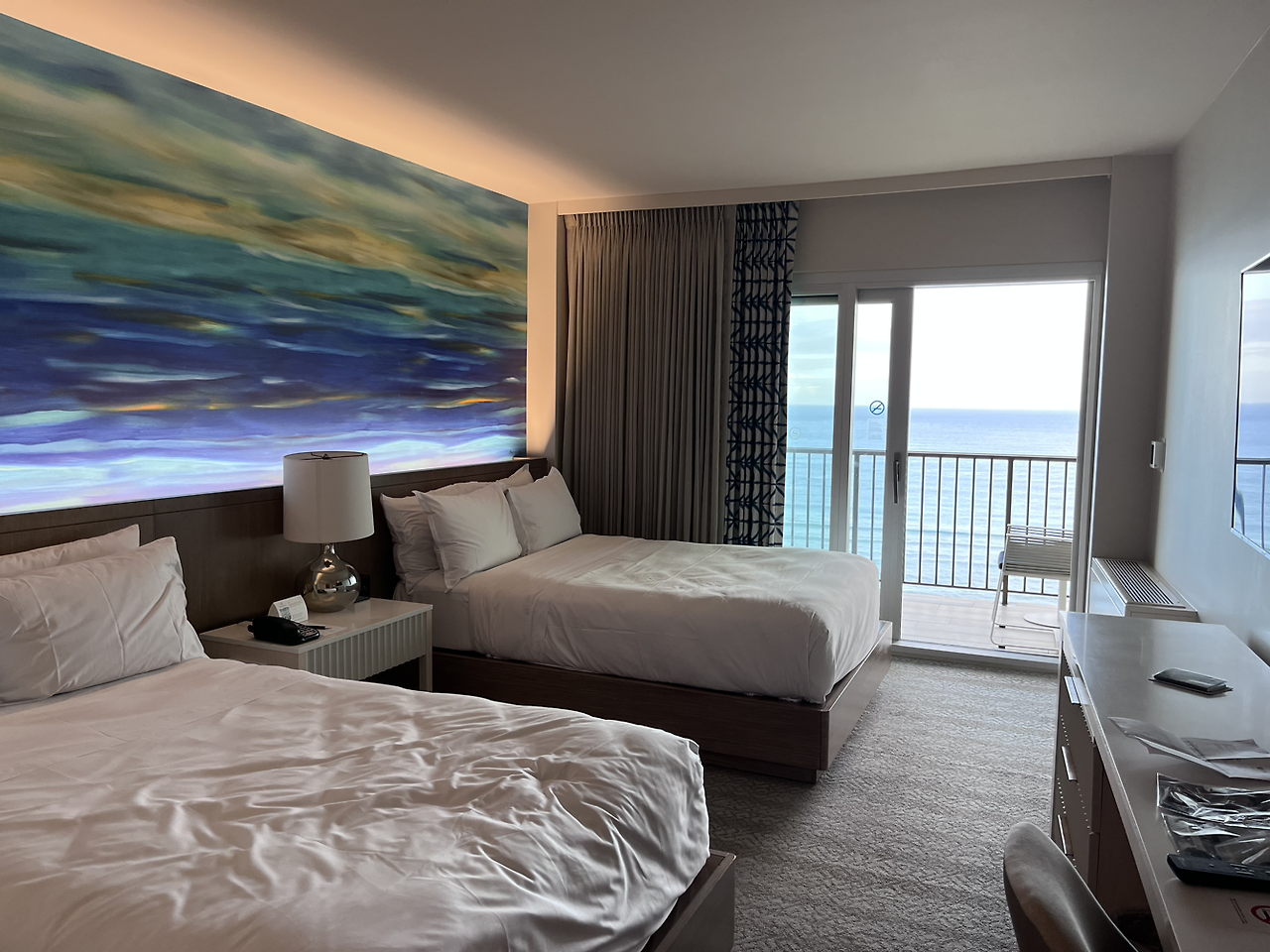 마침내 우리가 앞으로 머물 쉐라톤 와이키키 호텔에 도착했다. 오션프런트에 킹배드로 예약했으나 킹배드 룸이 다 없어졌다고 하여 25층의 더블 배드 2개로 배정받았다. 킹배드는 아쉬웠지만 고층에 배정받아 좋았다.