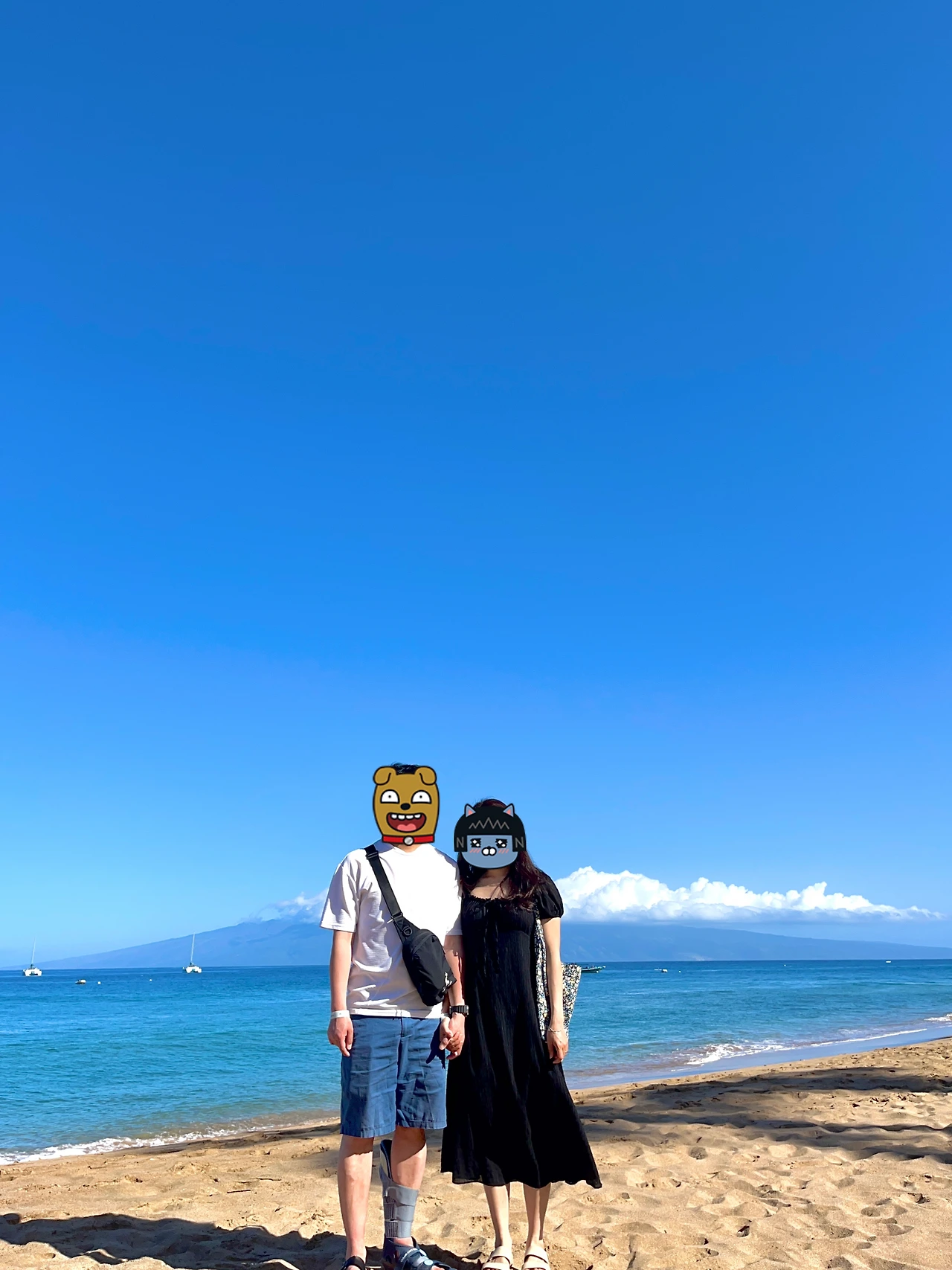 우리도 한국에서 가져온 미니삼각대로 해변에서 사진을 남기자고 했다. 근데 아뿔싸…! 여행 떠나기 전 아트박스에서 아무거나 급하게 산거였는데 삼각대에 달린 블루투스 리모컨이 50cm만 떨어져도 작동을 안 한다… 뭐 이딴 물건이 다 있는지… 고물을 샀다 ㅋㅋ 블루투스 리모컨 사용은 포기하고 삼각대에 핸드폰을 고정시킨 다음 타이머를 설정한 다음 한 장씩 사진을 찍는데 생각보다 마음에 드는 사진을 건지는 것이 어려웠다 ㅠㅠ