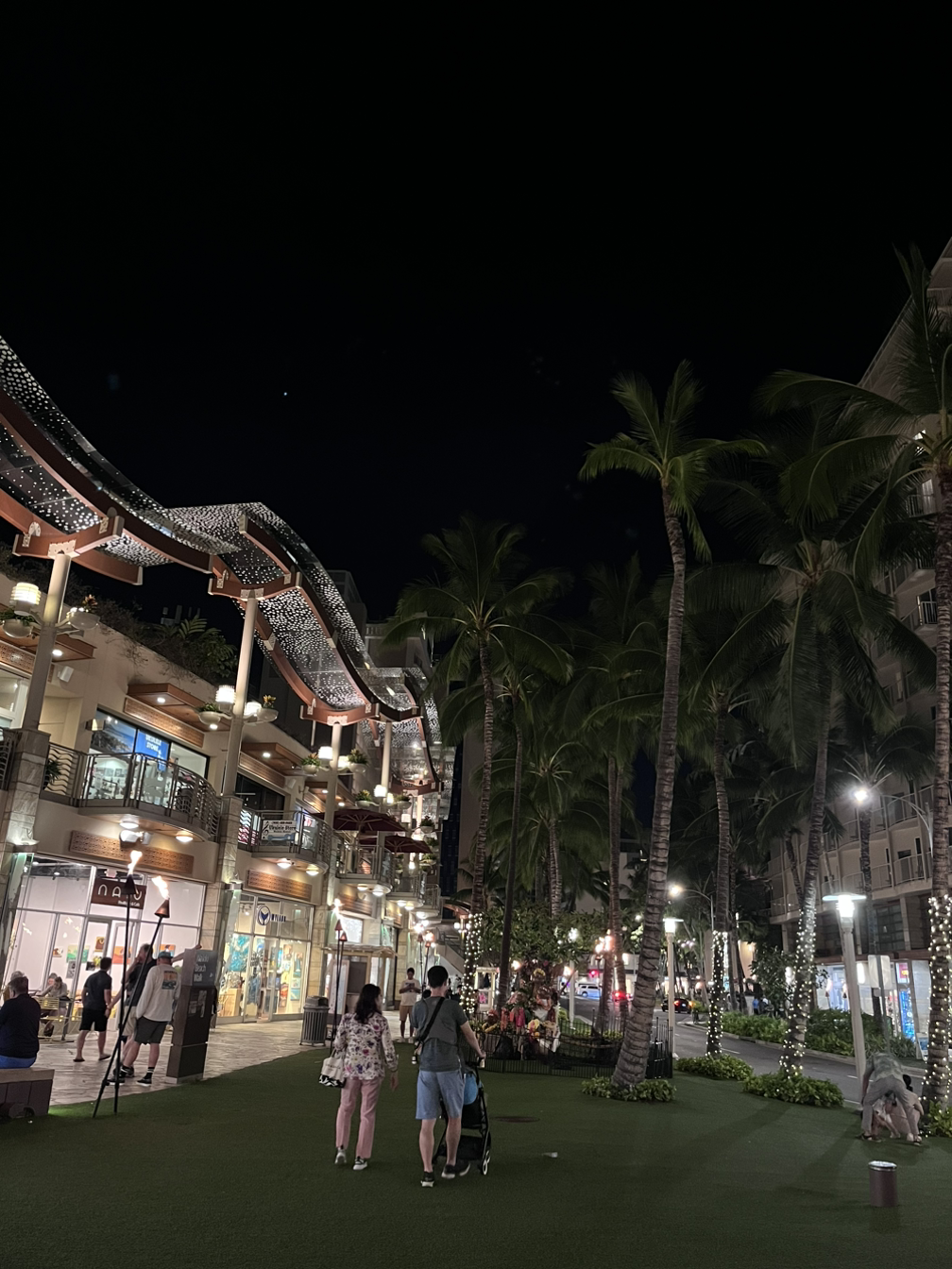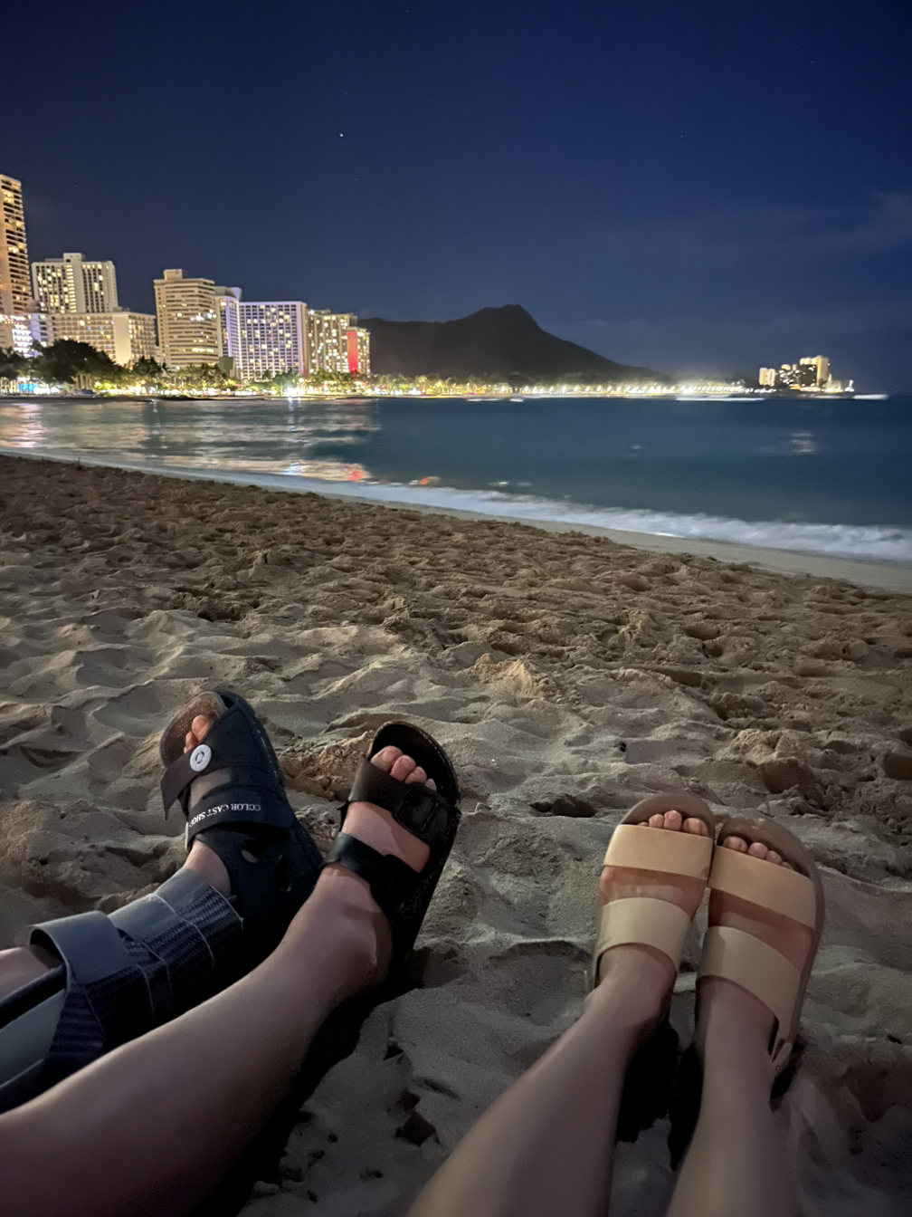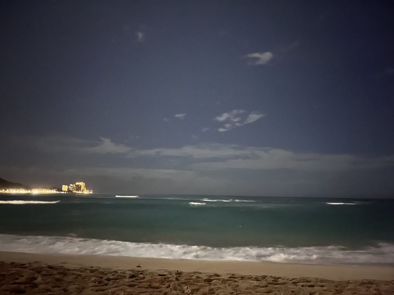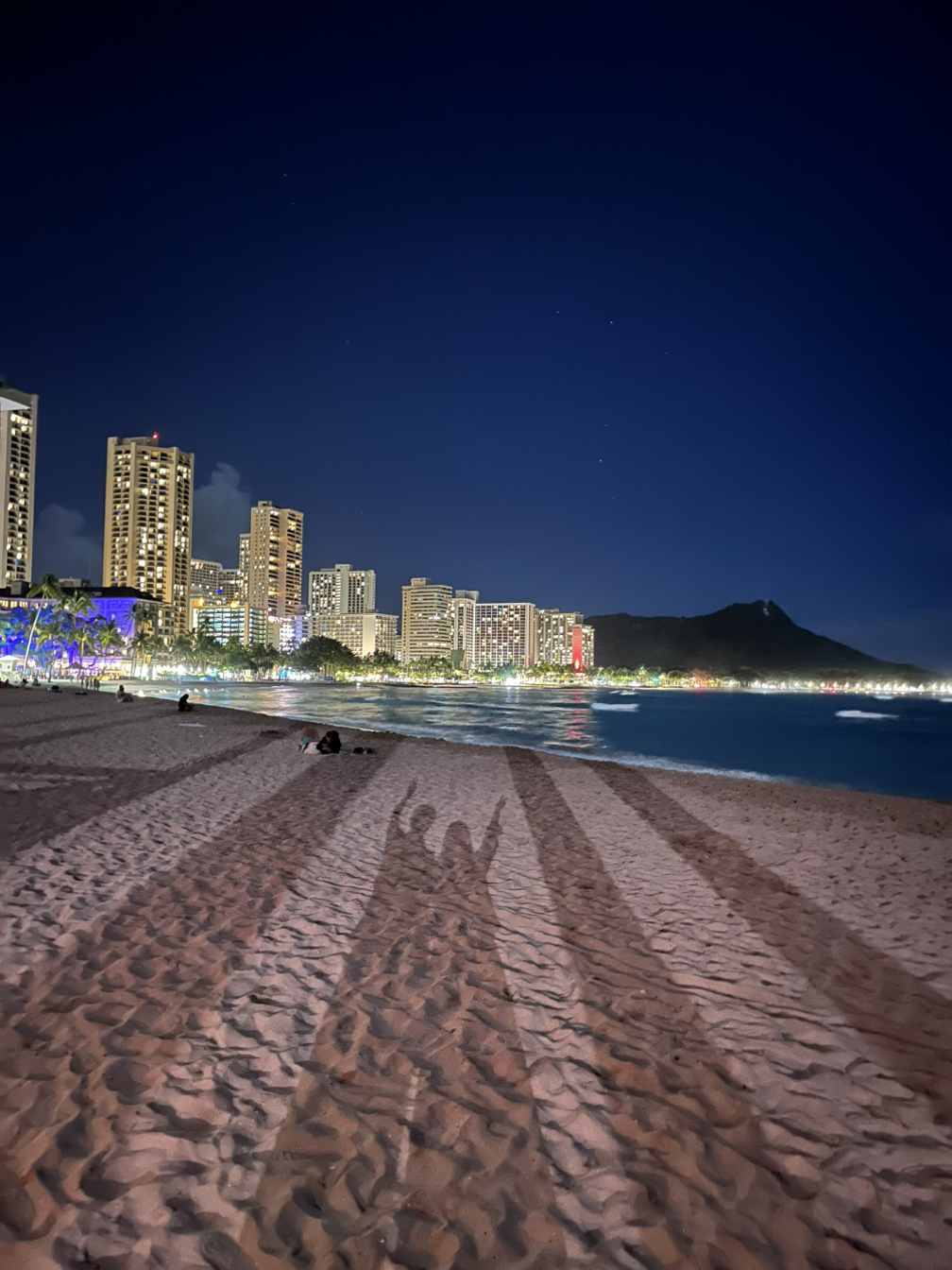 맥주까지 마시고 호텔로 돌아왔다. 룸으로 올라가기 전 해변에 들렀다. 저멀리 다이아몬드헤드가 보이고 반짝이는 호텔 건물들이 멋있었다. 밤에도 파도는 멈추지 않고 쳐댔다.