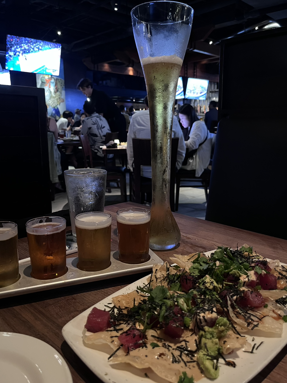 호텔로 그냥 들어가기가 아쉬워서 맥주나 한잔 마시고 들어가자고 했다. 마침 라멘집 근처에 추천받은 맥주집이 있었다. 저녁 8시쯤 갔는데 45분은 기다려야 한다고 했다. 문자메시지를 보내준다고 하여 번호 적어놓고 기다렸다.