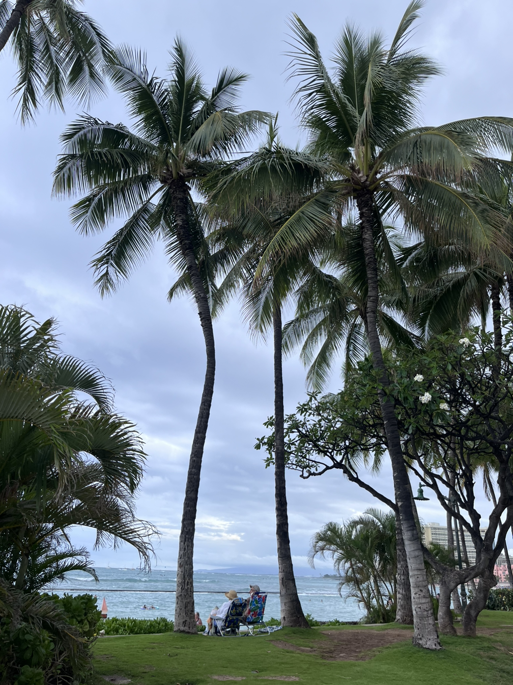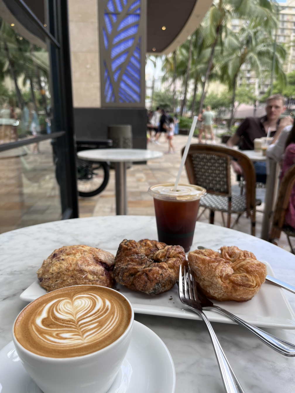 우리는 바깥 테이블에 자리를 잡고 커피를 마셨다. 고층 건물 속 야자수가 길쭉하게 서있는 풍경이 하와이에 왔구나 싶었다.