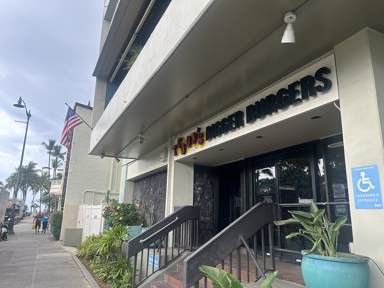 조금 물놀이하다가 씻으니 어느새 점심 먹을 시간이다. 미국에 왔으니 햄버거를 먹자고 하여 와이키키 해변 끝에 있는 테디스 버거에 갔다. 추천 받은 하와이안버거와 토네이도 버거를 하나씩 시켰다. 하와이안 버거는 이름처럼 파인애플이 들어간 햄버거다. 하와이가 파인애플이 유명하다고 한다. 하와이안피자를 안좋아해서 햄버거도 불호일거라 생각했다. 그래도 하와이까지 왔고 또 추천받은 햄버거이니 하와이안버거도 먹어 보기로 핬다. 반반 짤라달라고 해서 두가지 맛을 모두 맛볼 수 있었는데 파인애플 식감이 생각보다 느껴지지 않고 오히려 맛은 달콤해서 아주 맛있었다. 신랑과 나 둘다 만족~! 음료는 쉐이크로 먹어서 뭔가 미국 스타일을 제대로 느낀 기분이었다.