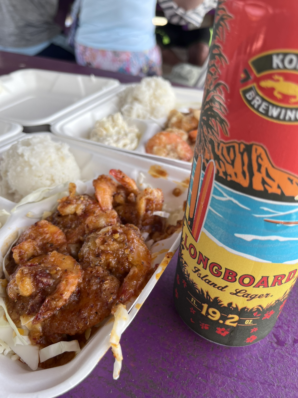 여기가 새우 양식이 가능해서 새우 요리가 유명하다고 한다. 백종원의 푸드트럭을 하며 백종원도 왔다 갔다고 한다. 원래 가장 유명한 식당이 있는데 가이드님이 한국인의 입맛에 더 맞는 곳이 있다며 Kahuku Shrimp로 데려가 줬다. 매운맛과 달콤한 맛 두가지 종류로 주문해주셨는데 아주 맛났다. 미국하면 핫윙처럼 자극적인 소스만 생각할 것 같은데 여기는 하와이라서 그런건지 가이드님이 맛있는 곳에 데려가서 그런 것인지 소스가 심하게 자극적이진 않은데 맛있어서 좋았다. 점심 먹기 전 새우랑 같이 먹으려고 편의점에서 맥주도 한 캔씩 사서 왔다. 가이드 투어로 미니벤을 타고 다니니까 직접 운전을 하지 않아도 되어 맥주도 한 잔 가볍게 마실 수 있고 좋다.