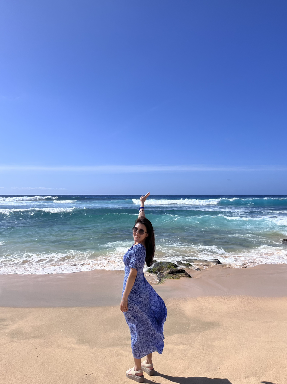 안내받은 내용에는 꽃이 그려진 하와이안 셔츠 또는 원피스를 맞춰 입고 오면 확실히 사진이 잘나온다는 이야기가 있었다. 그래서 그 전날 와이키키 도시를 돌아다니며 옷구경을 했는데 저렴한 것은 안 이쁘고 비싼 것은 이쁘지만 한국에서 과연 입을지, 또 앞으로 이 옷을 몇번이나 입을까 싶어서 선뜻 구매로 이어지지 않았다. 결국 나는 한국에서 사온 파란 원피스를 입고 신랑은 파란 반바지로 커플룩을 나름 맞춰입고 나갔다. 결론적으로는 꽃이 화려하진 않았지만 이 정도의 스타일도 나쁘지 않았다.