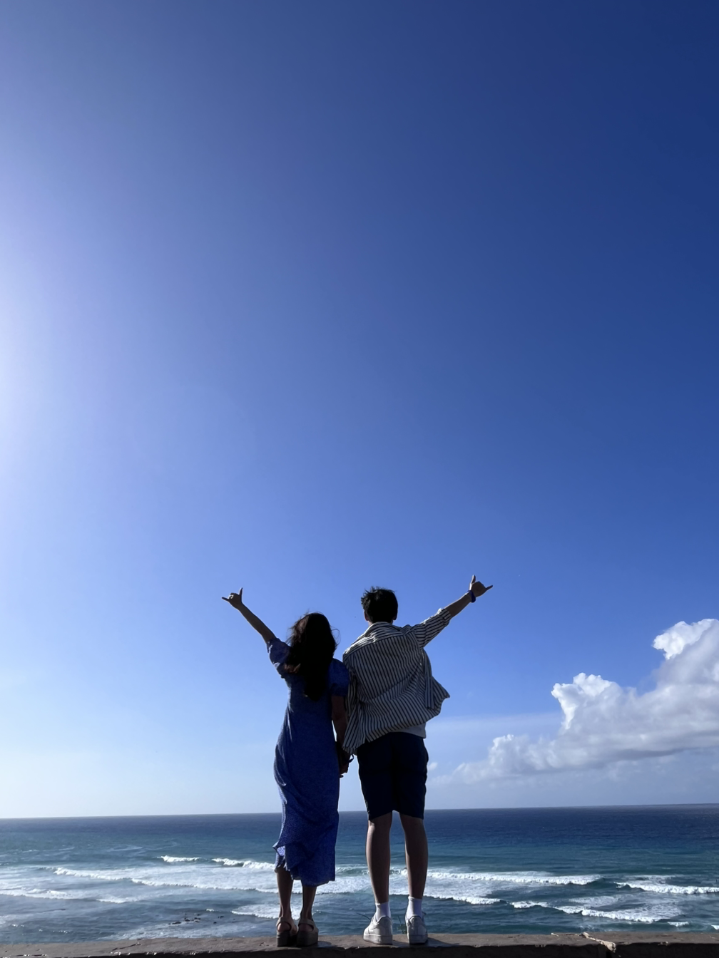 첫번째 스팟은 다이아몬드 헤드 정상 아래 쪽에 위치한 절벽이었다. 잠깐 내려서 가이드님이 한 커플씩 다 사진을 찍어주셨다. 가져온 삼각대와 블루투스 리모콘이 엉망진창이라 함께 찍은 사진은 포기했는데 투어하면서 이쁜 사진을 많이 건질 수 있었다. 푸른 바다와 힘쎈 바람이 참 시원했다.