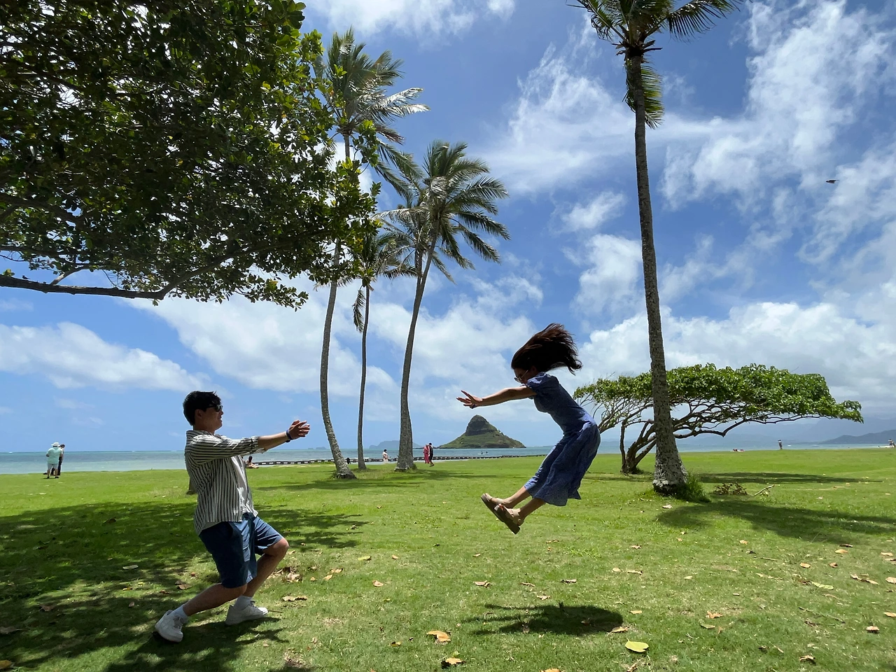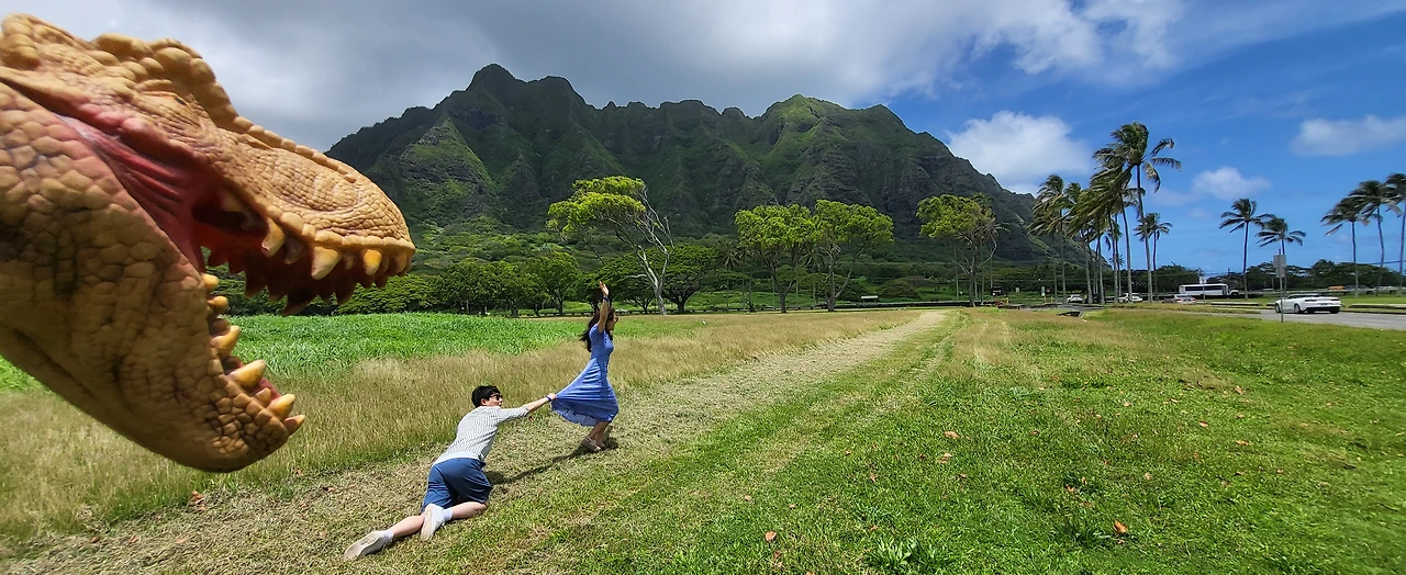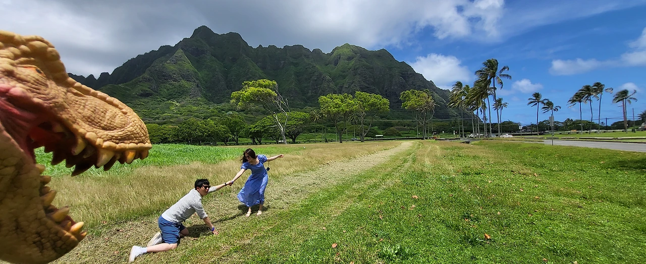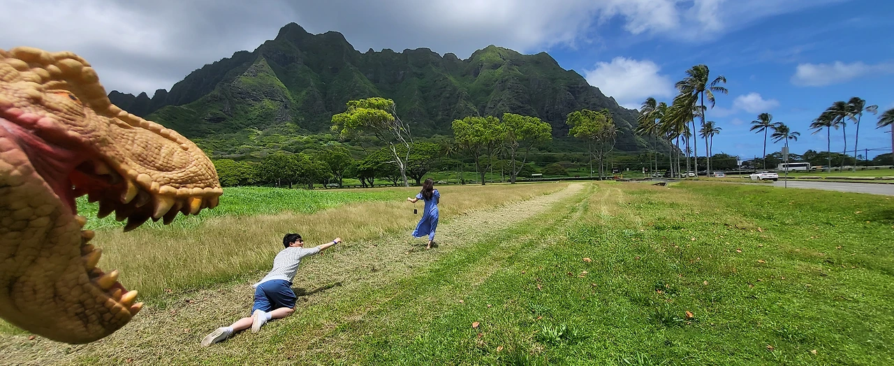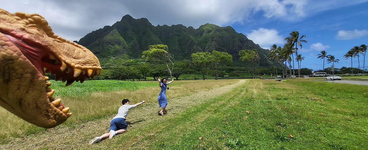 쿠알로아 랜치 앞 해변에서 공룡과 함께 사진도 찍고, 바다에 중국인 모자섬?이라 불리는 섬도 구경했다. 모자섬을 배경으로 가이드님이 점프샷을 찍어주셨다. 여기가 바람이 많이 불어 나무들이 한쪽으로 기울어지며 크기 때문에 장풍샷을 찍기 좋다고 하셨다. 다른 커플들은 다 남편이 점프를 하는데 울 커플은 남편이 발가락을 다쳐 내가 뛰기로 했다. 아주 살짝 뛰었을 뿐인데 가이드님이 사진을 넘 잘찍어주셨다. 웃겼다.