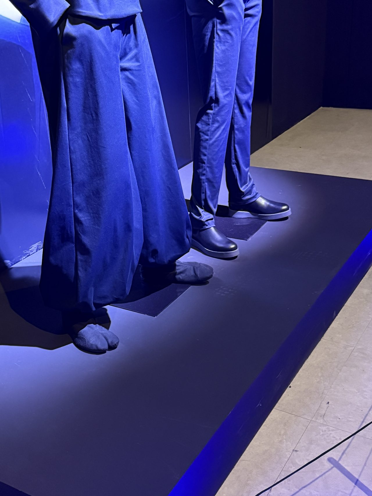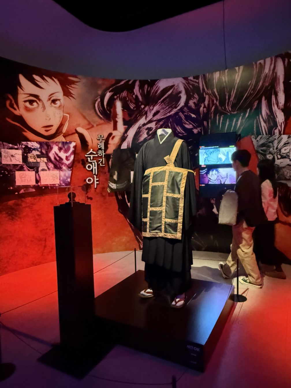 - 다음 섹션에서는 작중 최강자이자 가장 인기 많은 캐릭터인 '고죠‘와 그의 친구 '게토'의 교복 코스튬이 전시되어 있다. 두 사람은 시즌 2의 주인공이기도 하다. 같은 학교의 교복이지만 캐릭터의 성격에 따라 교복을 다르게 착용한다는 점이 덕후들 사이에서 많이 언급되는 포인트인데 그걸 노린 것 같은 생각이 들었다. (실제 이 교복 사진이 온라인에서 가장 많이 바이럴 된 이미지인 듯하다)