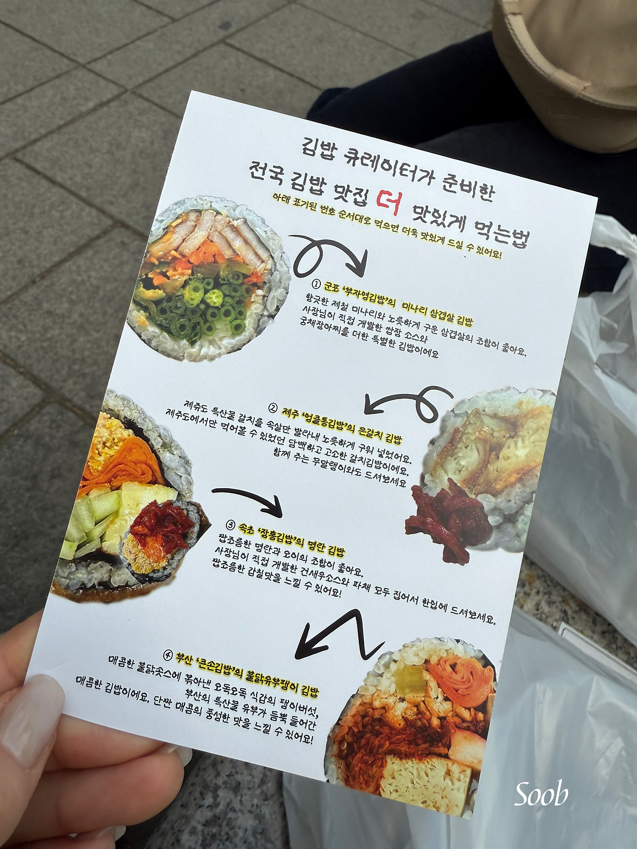 김밥 수령 시에는 메뉴 상세 소개가 적힌 리플릿을 주신다. 주문하고 나서 어떤 김밥이 있었는지 까먹었는데 설명을 찬찬히 읽어보면서 맛을 하나하나 느껴볼 수 있어서 좋았던 포인트다. '더 맛있게 먹을 수 있도록 김밥 먹는 순서까지 알려주시다니.. 이 분은 정말 진심이시구나' 하는 생각이 절로 들었다.