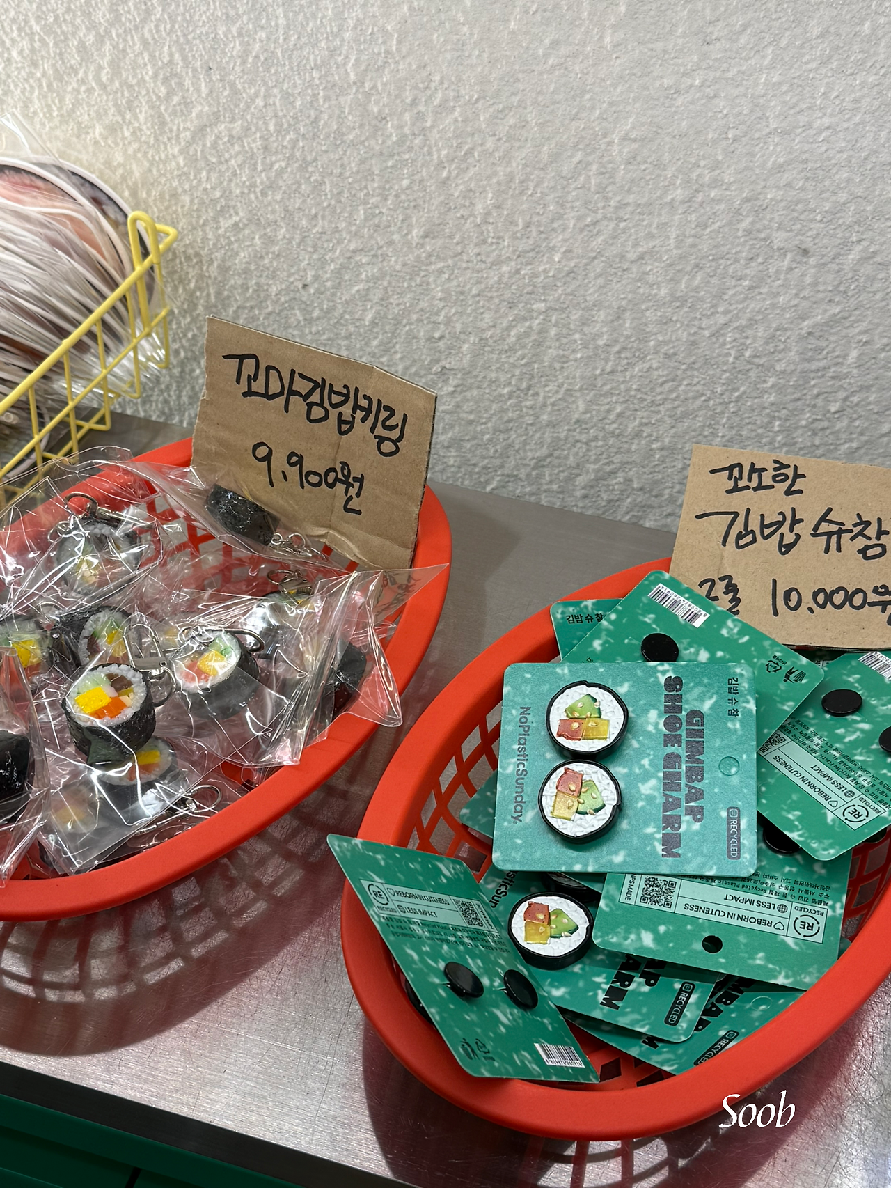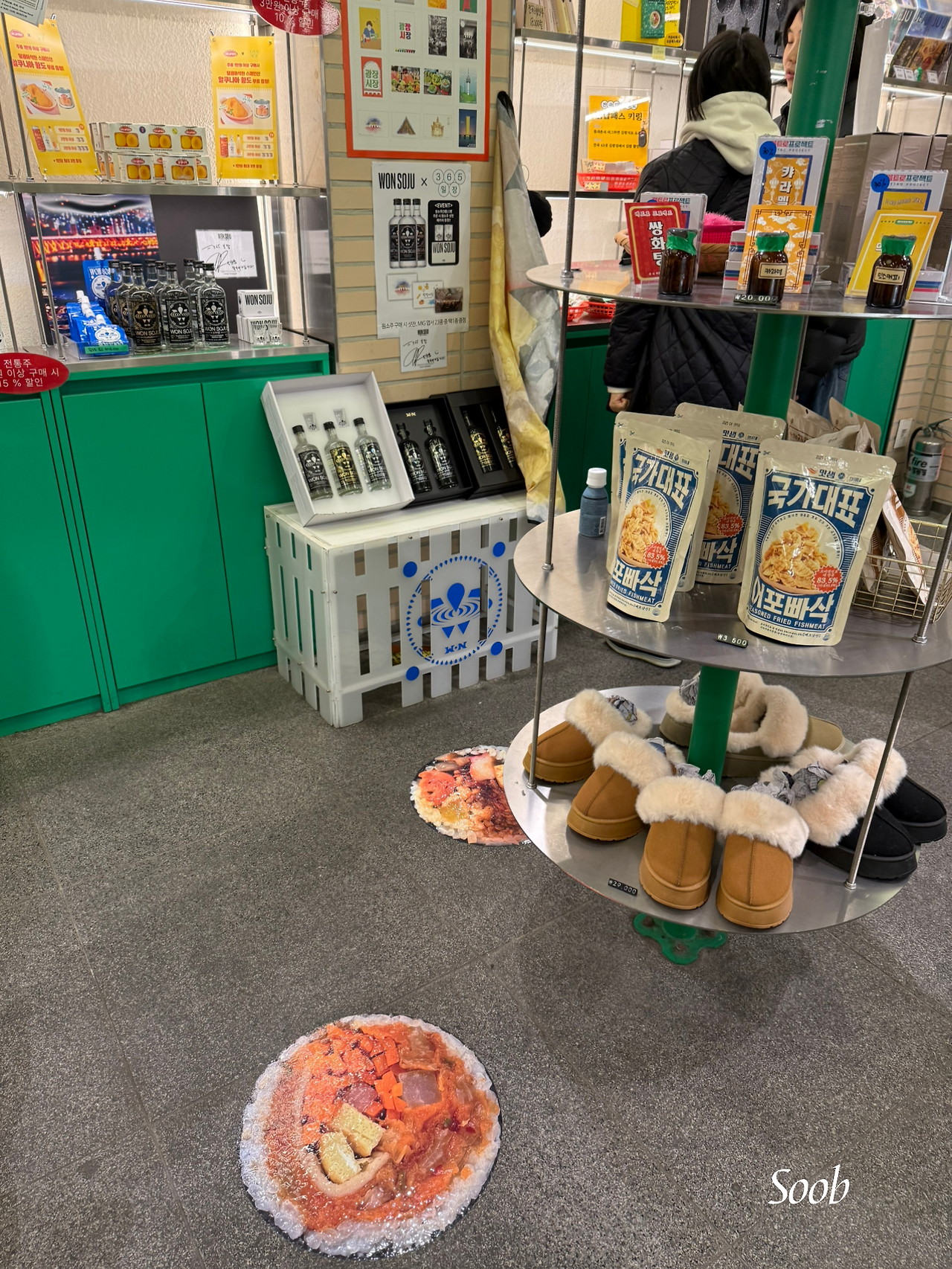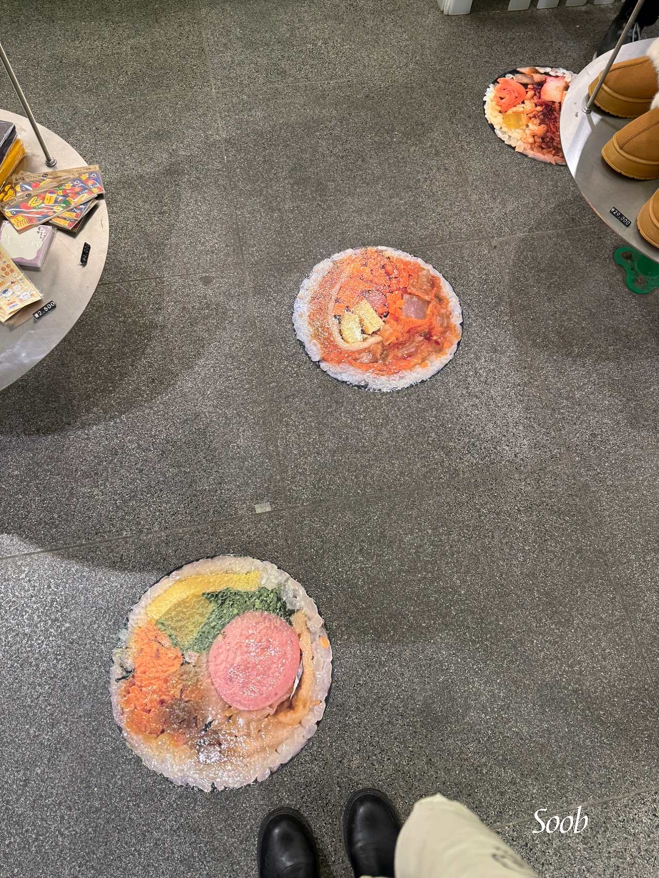 시장 중앙의 메인 섹션에서는 김밥 구매가 이루어졌고, 바로 옆에 있는 가게 ‘365일장‘ 그로서리 스토어에서는 김밥 굿즈를 팔고 있었다. 그로서리 스토어 내 숍인숍처럼 굿즈존이 있었는데 해당 섹션까지 헤매지 않고 갈 수 있도록 가게 입구 문부터 섹션까지 바닥에 김밥으로 안내선이 만들어져 있었다. 이 친절함에 다시 한번 감동했다.