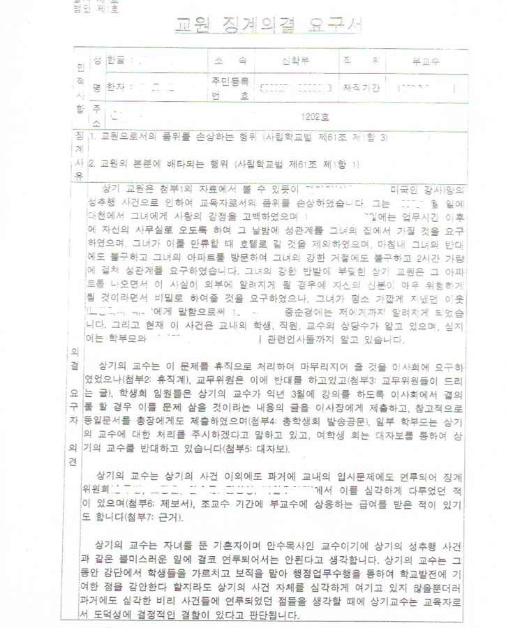 [전임 총장의 기획실장 시절 성범죄에 대한 징계의결 요구서]
