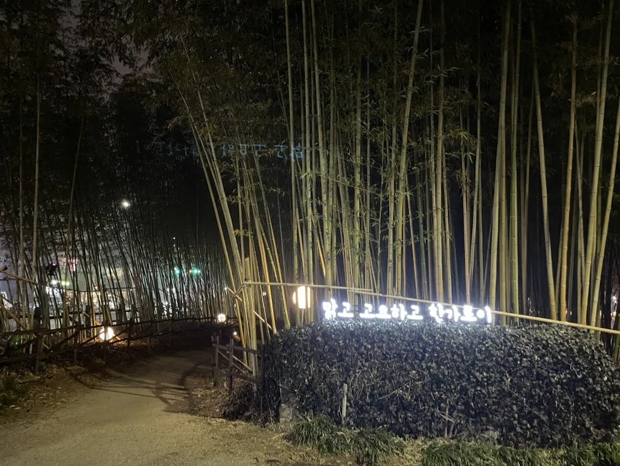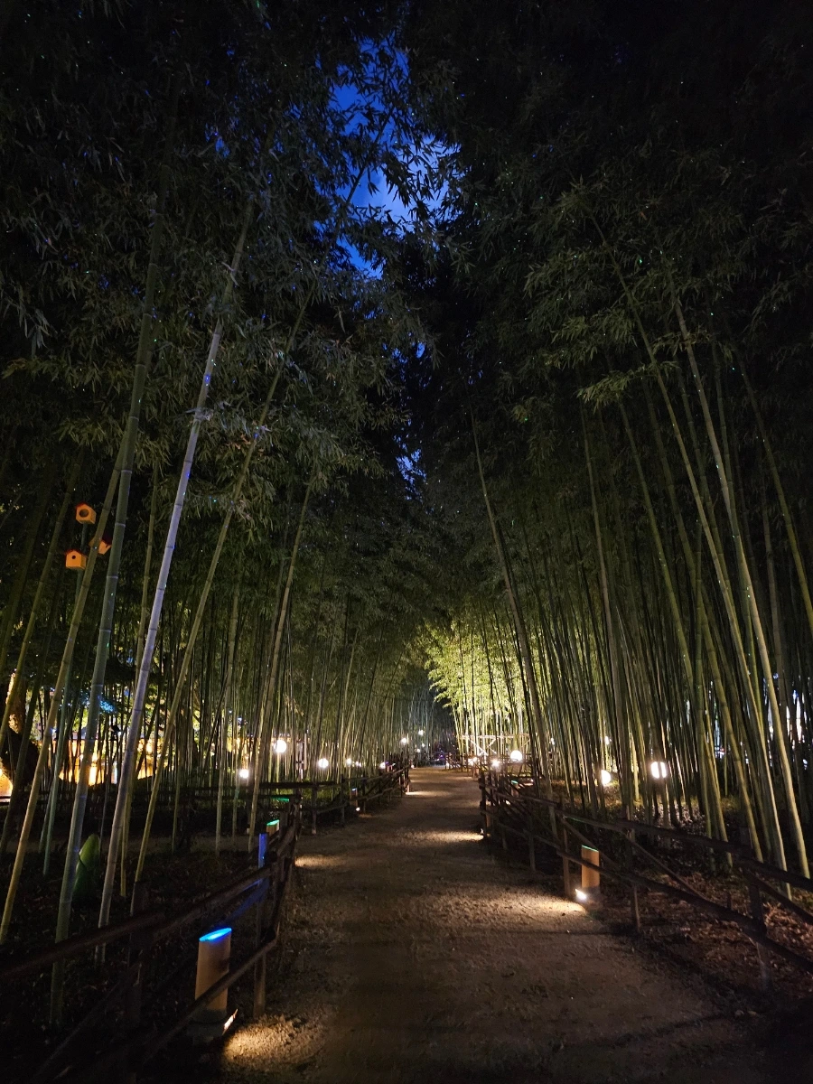 밤에는 대나무 위로 반딧불이를 연상케 하는 조명이 켜진다. 이런 인공적인 조명을 좋아하지 않는 옛날 사람이지만, 캄캄한 대숲길은 좀 무섭기 때문에 은은한 불빛이 있는 것이 반갑기도 하다.