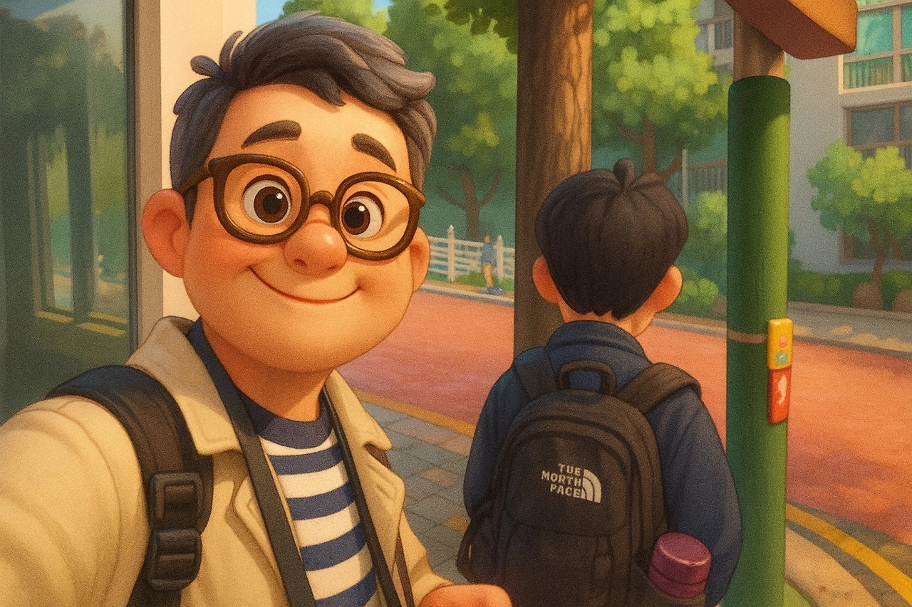 아빠는 몇 걸음 떨어져 아들의 뒷모습을 바라봤다.