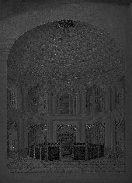 나는 그와 거리를 둘 겸 뒷걸음질로 돌아서서 궁전을 살펴보았어. 실내는 별다른 공간 없이 모든 곳이 트여있었지. 중앙에는 거대한 검은 석관이 있어. 바닥, 벽, 천장 그리고 석관까지 모든 것이 검은 대리석으로 이루어진 실내는 세밀한 꽃과 별로 장식되었어. 나는 그 전경을 가늠하기 위해 뒤로 몇 걸음 물러섰어. 그러자 하나의 그림이 보이기 시작해. 돔으로부터 아치 그리고 바닥의 타일까지 이어지는 거대한 장관. 마치치 공허한 초원에서 밤하늘을 올려다보는 기분이야.
