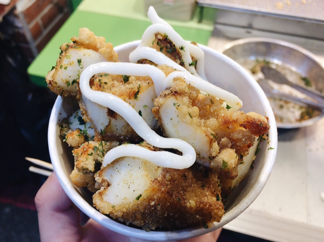 단수이 강변에 쭈욱 늘어선 가게들 중에 적당한 곳으로 들어가 보았다. 가게 앞에는 시식 가판대가 있었고 나쁘지 않아 하나 주문했다. 가게 앞에는 각종 소스를 직접 뿌려 맛을 낼 수 있도록 셀프 조리대(?)가 마련되어 있었다. 오징어를 위의 사진 뒤쪽에 작게 보이는 은색 접시에 담아 여러 가지 조미 가루를 뿌려 잘 섞은 후에 다시 내 컵에 담아 먹는 시스템이다. 와사비랑 여러 가지 뿌렸던 것 같고 내 사랑 마요네즈 역시 잊지 않고 뿌려주었다.
