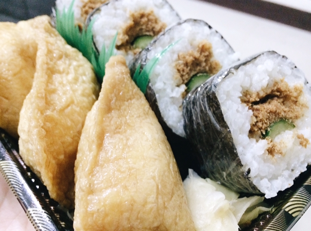 참고로 김밥(hand roll)을 쌀 때 랩 위에 올려놓고 랩과 함께 김밥을 만 후에 자르는 것 같다. 나는 것도 모르고 랩이 있는 채로 먹었다가 먹던 도중에 알았다. 어쩐지 목구멍에 넘어가지 않는 무언가가 자꾸 입 안에 남아있더라. 보통 '니기리 스시'라고 불리는 밥 알 위에 구를 얹은 형태의 초밥은 개당 10원 정도 하고, 비닐 포장이 되어있다. 각자 골라서 용기에 담으면 점원이 개수를 확인해 계산해준다.