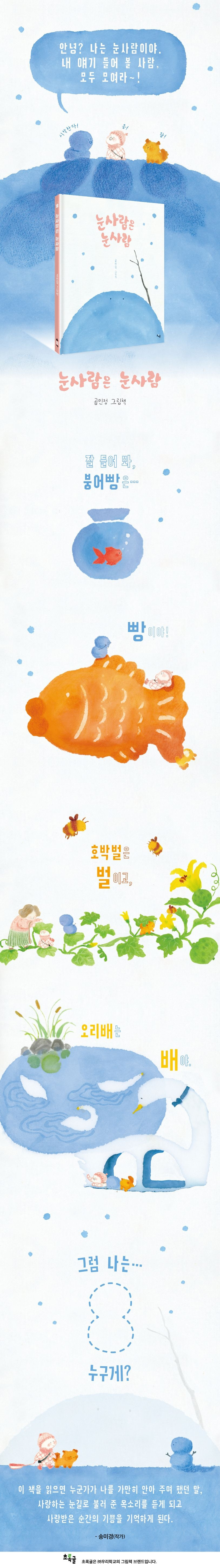 가장 최근 작업은 그림책 <눈사람은 눈사람>입니다. 붕어빵은 ‘빵’이고, 악어새는 ‘새’고, 강아지풀은 ‘풀’인 것처럼, 눈사람은 ‘사람'이라는 황당한(?) 주장을 늘어놓는 눈사람의 이야기입니다. 눈사람의 마음이 되어 신나게 말놀이 같은 궤변을 늘어놓다가 언젠가 이야기를 다시 바라보니, 왠지 눈사람이 안쓰럽게 느껴졌습니다. 끊임없이 스스로가 ‘사람’ 임을 주장하는 눈사람의 모습에서, 회사를 그만두고 사람들에게 스스로를 무엇으로든 증명해야 한다는 압박감에 힘들어하던 내가 보였습니다. 이야기 끝에서 눈사람보다 더 요상한(?) 주장을 펼치는 꼬마 아이를 보면서, 아- 내가 누구인지는 내가 정하면 되는구나, 꼭 누군가에게 나를 증명하려고 애쓸 필요는 없구나, 하는 위로를 받았습니다. 뒤돌아보니, 제 주된 역할은 ‘곰민정 담당 심리치료사’인 것 같네요. 곰민정의 심리를 들여다보고 이해하고 보듬어준 사례 기록집을 책으로 엮어 출판하는 작가도 겸업하고 있고요.
