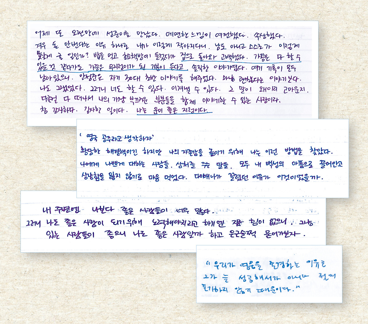 오늘 좌절해도 내일 다시 시작하는 힘. 가끔 제가 좋아하는 한지와 제가 닮았다는 생각 합니다. 한지는 얇고 약해 보이지만 의외로 질기고 강합니다. 오늘은 어려운 상황에 풀 죽고 기운 빠져도, 집에 오는 길 시장에서 제철재료를 잔뜩 사 와서 뜨끈한 저녁을 챙겨 먹고, 내일 또 최선을 다하기 위해 계획을 짜고 실행하는 힘. 저는 그런 힘이 강한 것 같습니다.