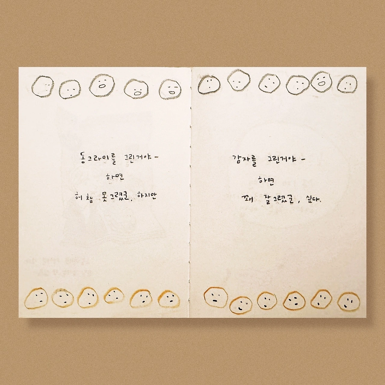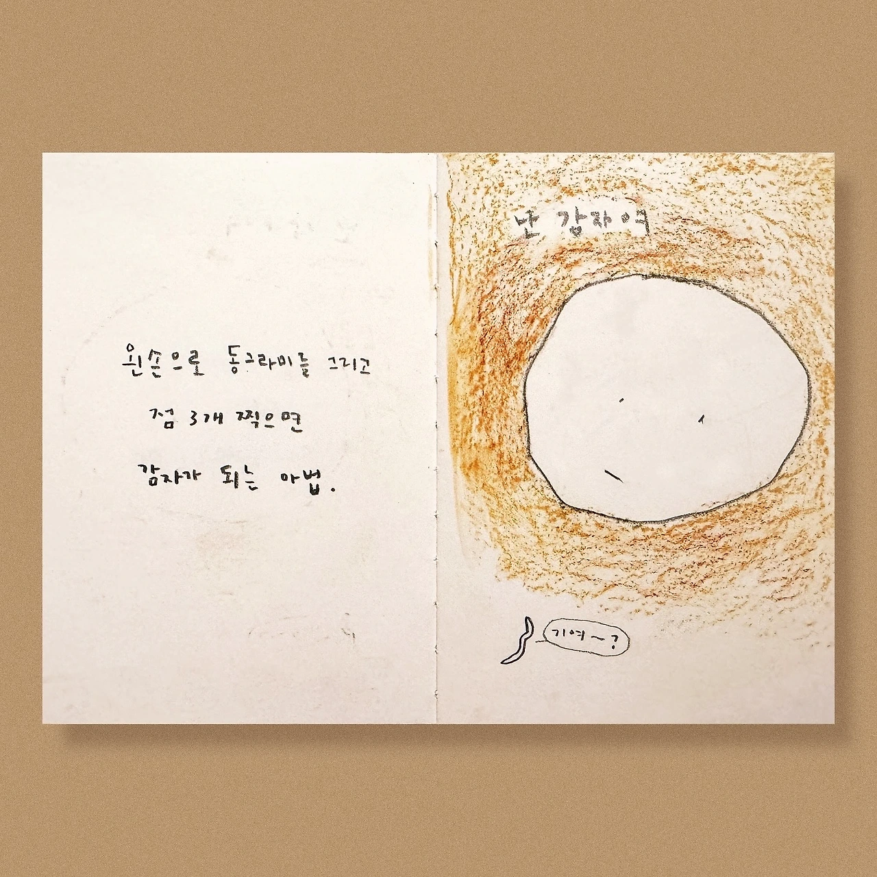 최근에 시작한 ‘감자’ 작업의 흐름을 소개하겠습니다. 기,우연히 무언가 눈에 들어옵니다. 예를 들자면 갑자기 아빠가 사 오신 치악산 감자 박스를 눈여겨보게 된다거나, 길 가다 엉뚱한 곳에 놓인 감자를 발견하게 된다던가, 집에서 싹 난 감자를 수경재배로 키우게 된다던가- 하는 다소 어이없는 방식으로 무언가 눈에 들어옵니다. 승, 계속 그려봅니다. 통감자, 감자튀김, 감자전, 싹 난 감자, 잘린 감자, 굴러가는 감자, 감자 쪼아 먹는 비둘기 등등 의식의 흐름처럼 몇 주간 생각나는 감자에 대한 이미지들을 한 노트에 쏟아냅니다. 감자를 나무위키에 검색해서 잡다하고 재미있는 정보들을 찾아본다던가, 감자도리 애니메이션을 본다던가, 감자와 함께 연상되는 모든 것들을 글로도 그림으로도 노트에 기록하고, 그 기록을 보고 또 봅니다. 전, 계속 그리다 발견한 의미를 길어냅니다. 감자에 대해 발견한 진실들 - 특별한 맛이 없어서 더 다양한 음식 이 될 수 있다거나, 동그라미처럼 완벽하지 않아도 울퉁불퉁한 대로 괜찮다거나 - 하는 것들을 중심으로 ‘승’에서 그린 그림들과 글들을 재배열해 봅니다. 결, 한 권의 책으로 엮어냅니다. 이 작업(기-승-전-결)을 계속하다 보면 점점 더 완성도 있는 책이 됩니다.