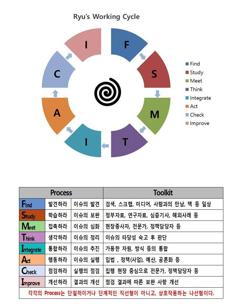 국회에서 세월과 경험이 쌓이면서 나름 제가 일하는 저만의 방식을 정리해 본 적이 있습니다. 아래 그림인데요, 이 흐름으로 저의 기-승-전-결이 설명이 될 것 같습니다.