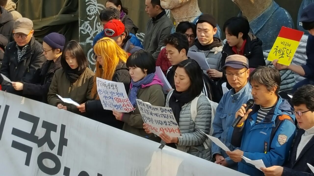 음...보통 기: 사회적 현상( 소수나 약자의 고통을 파생시키는)을 보고, 시민들과 문제의식을 공유해야겠다는 충동이 올라오면 어디 콕 박혀서 작품을 씁니다. 그리고 승: 서울로 돌아와 각종 기금 지원신청을 하고, 전: 단원들과 함께 공연을 올립니다. 결: 합평이나 정산을 통해 공연을 마무리 합니다. 또 극단 고래는 그 사이사이 사회적 연대 활동을 많이 하는 편입니다. 그런 활동들이 또 다른 기:를 불러오게 되는 거죠.