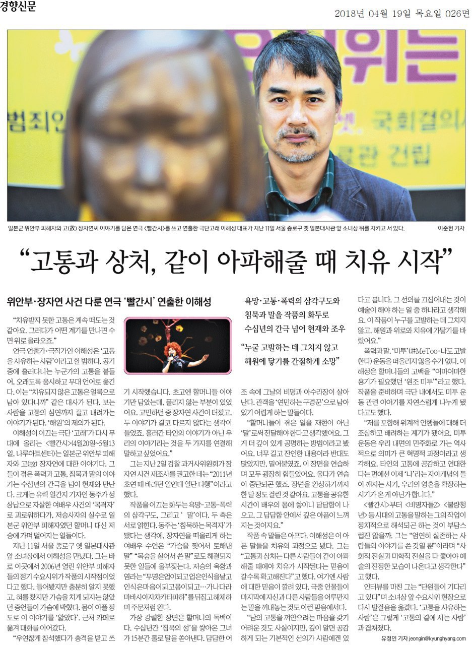 저는 지금 연극 연출과 극작을 주로 하고 있고 가끔 배우로 활동하기도 합니다. 극단 고래 대표로 있고 남북연극교류위원회 위원장을 맡고 있습니다. /극단고래 페이스북