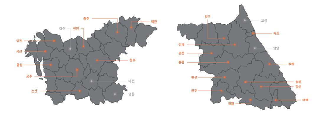 충청. 강원권 기초문화재단, 출처: 전국지역문화재단연합회 홈페이지