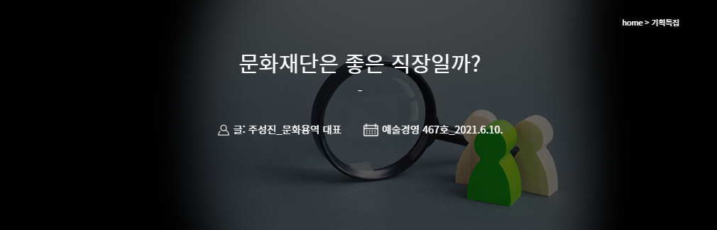 <예술경영 윕진> 문화재단 기획특집에서 다루었던 내용 중에 주성진 선생님께서 쓴 <문화재단은 좋은 직장일까?>라는 글이 있었습니다. 당시 이 글은 현장에 종사하는 분들에게 많은 공감을 받았습니다. 물론 이 글이 문화재단 전체를 보여주는 것은 아닐 수 있습니다. 하지만 이런 부분이 있다는 것을 충분히 알고 관심을 갖는 것은 필요해 보입니다.