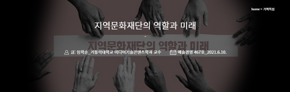 <예술경영웹진> 편집위원으로 있을 때, '지역문화재단' 특집 기획을 함께 진행한 적이 있습니다. 당시 좋은 글들이 많아서, 해당 텍스트로 강의와 토론을 이어가 보겠습니다. 아래 글은 가톨릭대 임학순 교수님이 썼던, <지역문화재단의 역할과 미래>라는 글입니다. 한번 읽어보시죠.
