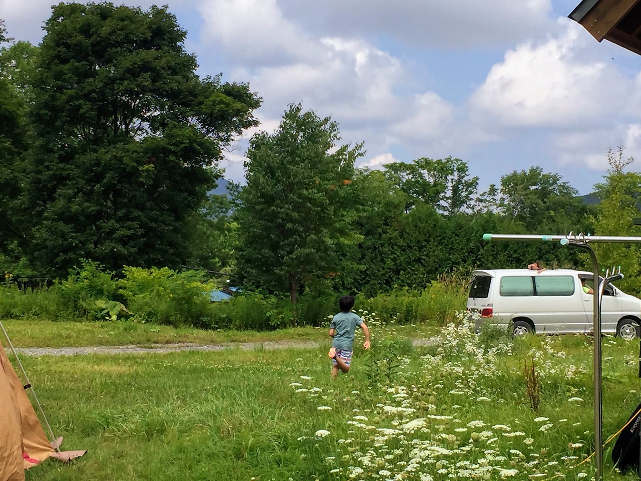 숙소 바로 옆에 있는 캠핑장에서 어제 처음 만난 친구들과 오늘 아침에도 같이 놀기로 한 모양이다. 얘기를 들어보니 그 아이들은 여기서 한 시간쯤 걸리는 토마코마이苫小牧에 사는데 주말을 맞아 부모들과 함께 우리 동네로 캠핑 여행을 왔단다. 우리가 머물고 있는 히다카日高 마을은 높고 낮은 산들에 둘러싸여 있고, 그 한가운데를 사루강沙流川이라는 꽤나 큰 강줄기가 가로질러 흐르는 아름다운 시골마을. 강 바로 옆에 넓직하고 깨끗하고 시설도 훌륭한 캠핑장이 있는데, 홋카이도에서 삿포로나 토마코마이 등 큰 도시에 사는 사람들이 주말을 보내기 위해 자주 찾는 곳이다. 지금과 같은 여름 성수기에는 주말에 예약이 꽉 찰 정도로 인기가 많다. 우리가 이번 여름동안 머무는 집은 캠핑장 바로 위편에 위치하고 있어 캠핑을 즐기는 사람들의 모습이 창 밖으로 보일 정도이다. 그렇다고 뭐 캠핑장에 놀러온 사람들하고 어울리고 노는 것은 아니다.